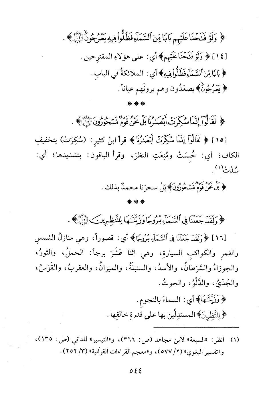 [15] {لَقَالُوا إِنَّمَا سُكِّرَتْ أَبْصَارُنَا} قرأ ابنُ كثيرٍ: (سُكِرَتْ) بتخفيفِ الكاف؛ أي: حُبِسَتْ ومُنِعَتِ النظرَ، وقرأ الباقون: بتشديدها؛ أي: سُدَّتْ (¬1).