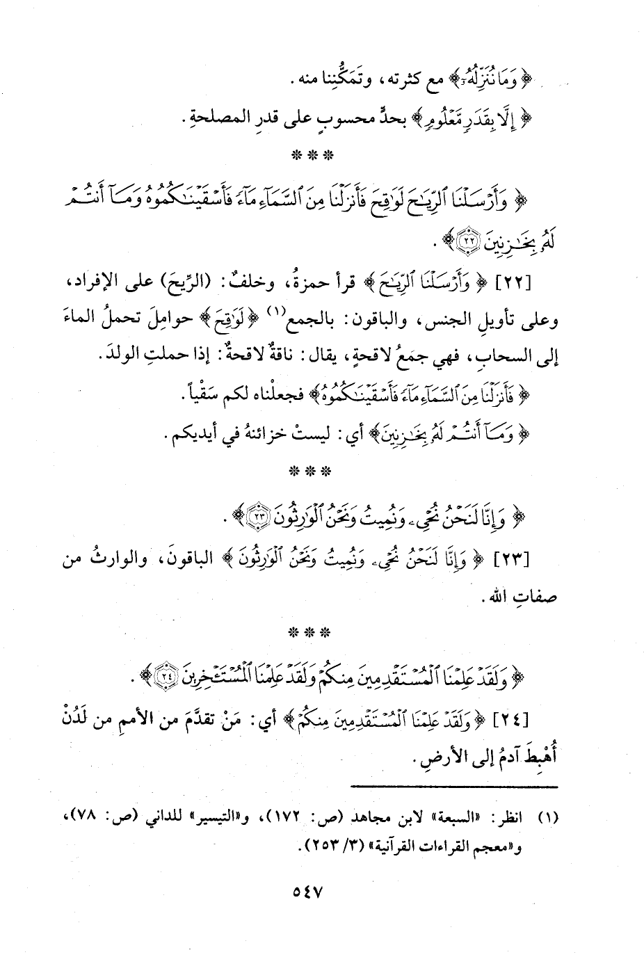 [22] {وَأَرْسَلْنَا الرِّيَاحَ} قرأ حمزةُ، وخلفٌ: (الرِّيحَ) على الإفراد، وعلى تأويلِ الجنس، والباقون: بالجمع (¬1) {لَوَاقِحَ} حوامِلَ تحملُ الماءَ إلى السحابِ، فهي جمَعُ لاقحةٍ، يقال: ناقةٌ لاقحةٌ: إذا حملتِ الولدَ.