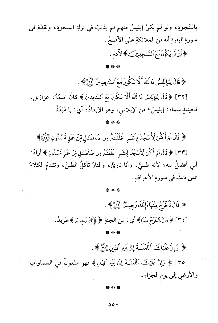 [33] {قَالَ لَمْ أَكُنْ لِأَسْجُدَ لِبَشَرٍ خَلَقْتَهُ مِنْ صَلْصَالٍ مِنْ حَمَإٍ مَسْنُونٍ} أرادَ: أني أفضلُ منه؛ لأنه طينيٌّ، وأنا ناريٌّ، والنارُ تأكلُ الطينَ، وتقدمَ الكلامُ على ذلكَ في سورةِ الأعرافِ.
