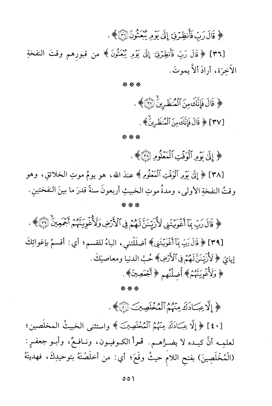 [38] {إِلَى يَوْمِ الْوَقْتِ الْمَعْلُومِ} عندَ الله، هو يومُ موتِ الخلائقِ، وهو وقتُ النفخةِ الأولى، ومدةُ موتِ الخبيثِ أربعونَ سنةً قدرَ ما بينَ النفختينِ.