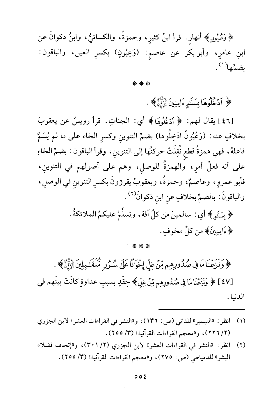 [46] يقال لهم: {ادْخُلُوهَا} أي: الجناتِ. قرأ رويسٌ عن يعقوبَ بخلافٍ عنه: (وَعُيُونٌ ادْخِلُوها) بضمِّ التنوينِ وكسرِ الخاء على ما لم يُسَمَّ فاعلهُ، فهي همزةُ قطعٍ نُقِلَتْ حركتُها إلى التنوينِ، وقرأ الباقون: بضمِّ الخاءِ على أنه فعلُ أمرٍ، والهمزةُ للوصلِ، وهم على أصولهم في التنوينِ، فأبو عمروٍ، وعاصمٌ، وحمزةُ، ويعقوبُ يقرؤونَ بكسرِ التنوينِ في الوصلِ، والباقونَ: بالضمِّ بخلافٍ عنِ ابنِ ذكوانَ (¬2).