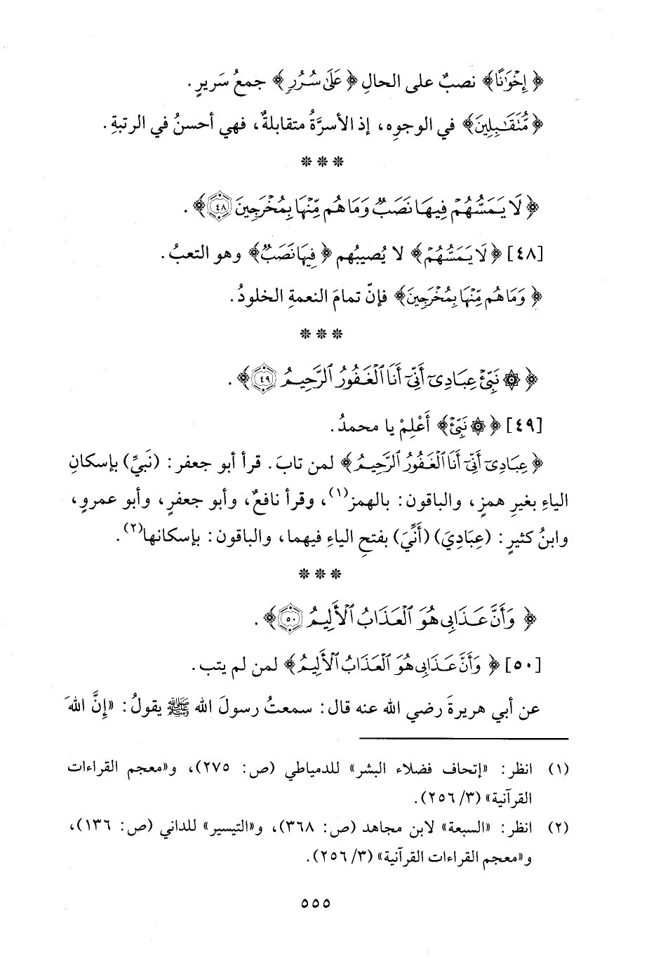{عِبَادِي أَنِّي أَنَا الْغَفُورُ الرَّحِيمُ} لمن تابَ. قرأ أبو جعفر: (نَبيِّ) بإسكانِ الياءِ بغيرِ همزٍ، والباقون: بالهمز (¬1)، وقرأ نافعٌ، وأبو جعفرٍ، وأبو عمروٍ، وابنُ كثيرٍ: (عِبَادِيَ) (أَنِّيَ) بفتحِ الياءِ فيهما، والباقون: بإسكانها (¬2).