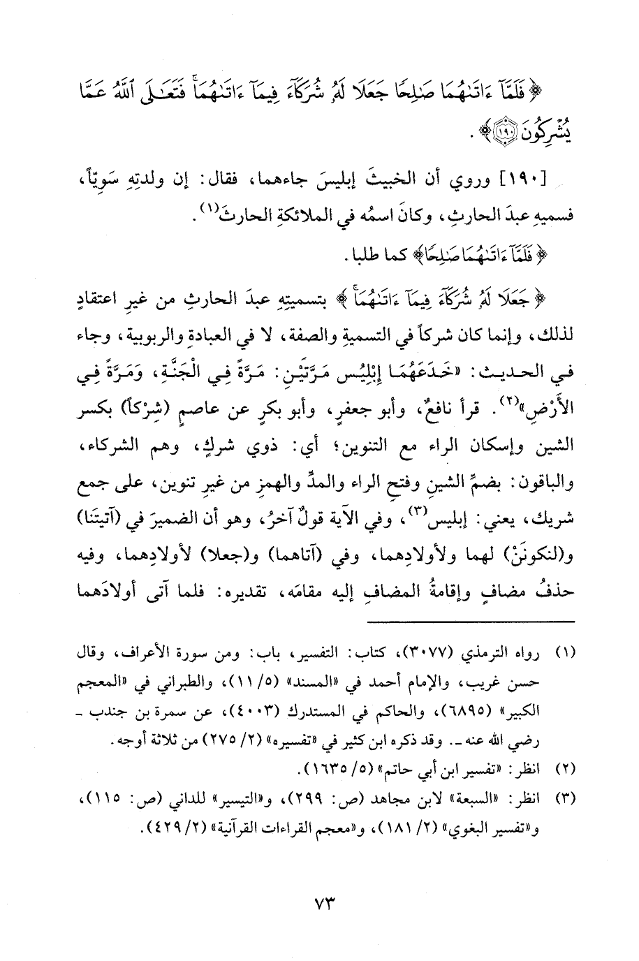 {جَعَلَا لَهُ شُرَكَاءَ فِيمَا آتَاهُمَا} بتسميتِهِ عبدَ الحارثِ من غيرِ اعتقادٍ لذلك، وإنّما كان شركًا في التسميةِ والصِّفَة، لا في العبادةِ والربوبية، وجاء في الحديث: "خَدَعَهُا إِبْلِيُس مَرَّتَيْنِ: مَرَّةً فِي الْجَنَّةِ، وَمَرَّةً فِي الأَرْضِ" (¬2). قرأ نافعٌ، وأبو جعفرٍ، وأبو بكرٍ عن عاصمٍ (شِرْكًا) بكسر الشين وإسكان الراء مع التّنوين؛ أي: ذوي شركٍ، وهم الشركاء، والباقون: بضمِّ الشينِ وفتح الراء والمدِّ والهمزِ من غيرِ تنوين، على جمع شريك، يعني: إبليس (¬3)، وفي الآية قولٌ آخرُ، وهو أن الضميرَ في (آتيتَنا) و (لنكونَنْ) لهما ولأولادِهما، وفي (آتاهما) و (جعلا) لأولادِهما، وفيه حذفُ مضافٍ وإقامةُ المضافِ إليه مقامَه، تقديره: فلما آتى أولادَهما