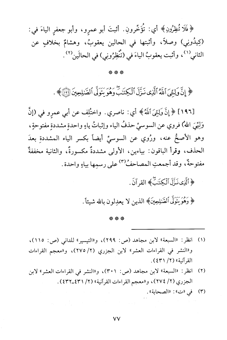 [196] {إِنَّ وَلِيِّيَ اللَّهُ} أي: ناصري. واختُلِف عن أبي عمرٍو في (إنَّ وَلِيَّيَ اللهُ) فروي عن السوسيِّ حذفُ الياء وإثباتُ ياءٍ واحدةٍ مشددةٍ مفتوحةٍ، وهو الأصحُّ عنه، ورُوي عن السوسيِّ أيضًا يكسر الياء المشددةِ بعدَ الحذف، وقرأ الباقون: بياءين، الأولى مشددةٌ مكسورةٌ، والثّانية مخففةٌ مفتوحةٌ، وقد أجمعتِ المصاحفُ (¬3) على رسمِها بياءٍ واحدة.