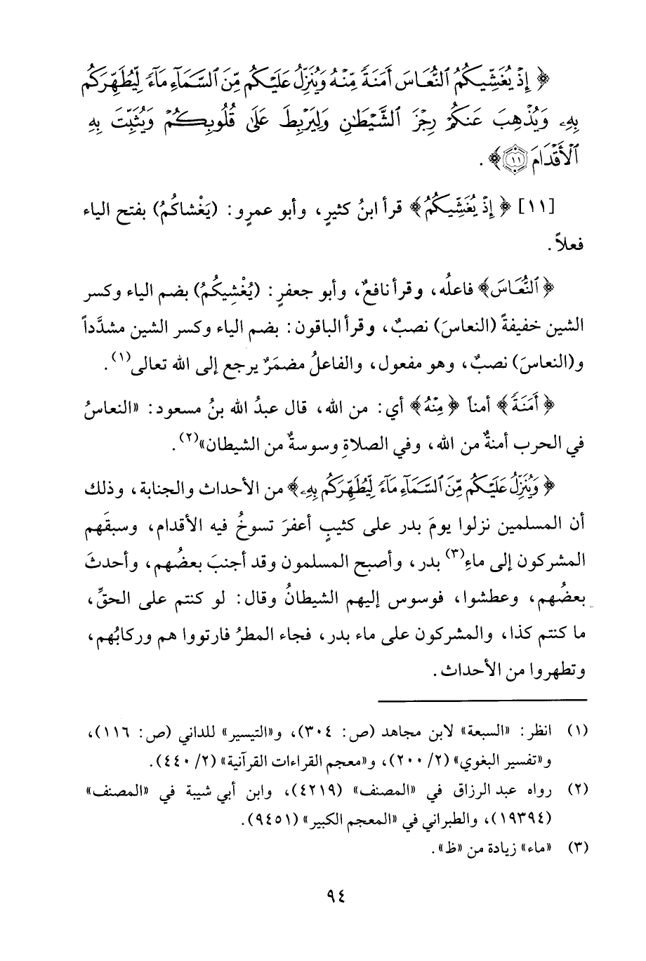 [11] {إِذْ يُغَشِّيكُمُ} قرأ ابنُ كثيرٍ، وأبو عمرٍو: (يَغْشاكُمُ) بفتح الياء فعلًا.