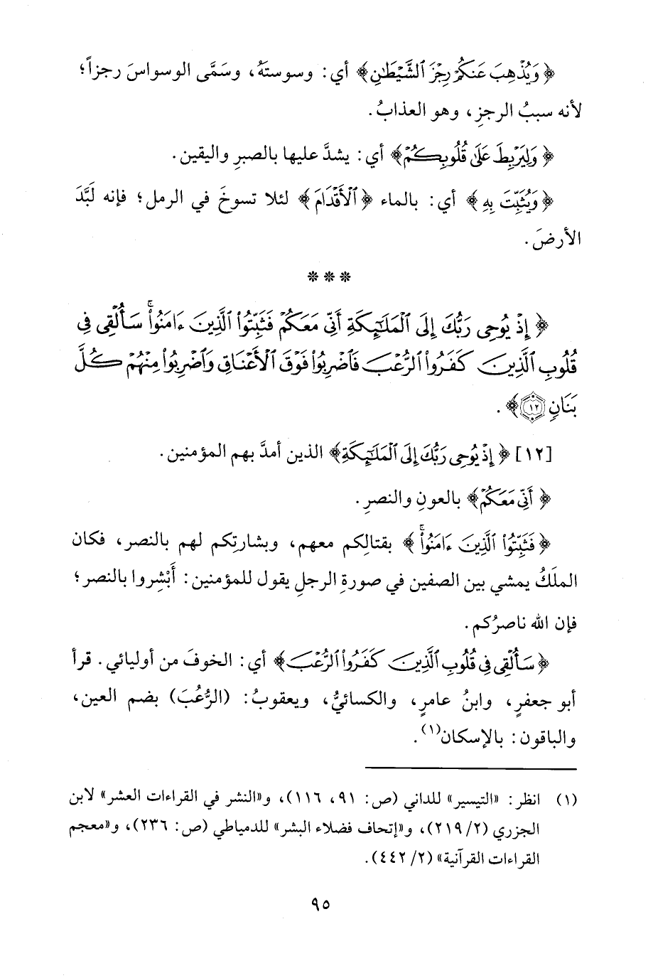 {سَأُلْقِي فِي قُلُوبِ الَّذِينَ كَفَرُوا الرُّعْبَ} أي: الخوفَ من أوليائي. قرأ أبو جعفرٍ، وابنُ عامرٍ، والكسائيُّ، ويعقوبُ: (الرُّعُبَ) بضم العين، والباقون: بالإسكان (¬1).