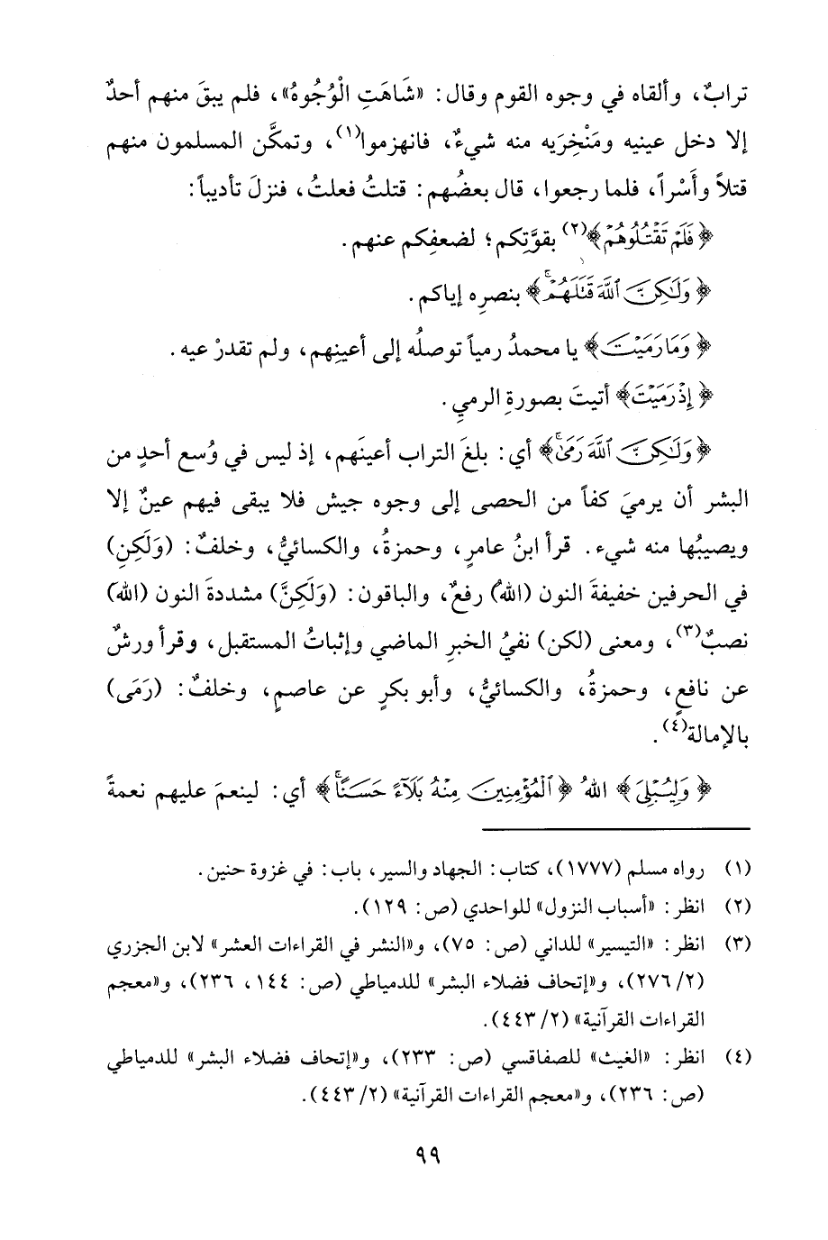 ترابٌ، وألقاه في وجوه القوم وقال: "شَاهَتِ الْوُجُوهُ"، فلم يبقَ منهم أحدٌ إِلَّا دخل عينيه ومَنْخِرَيه منه شيءٌ، فانهزموا (¬1)، وتمكَّن المسلمون منهم قتلًا وأَسْرًا، فلما رجعوا، قال بعضُهم: قتلتُ فعلتُ، فنزلَ تأديبًا: