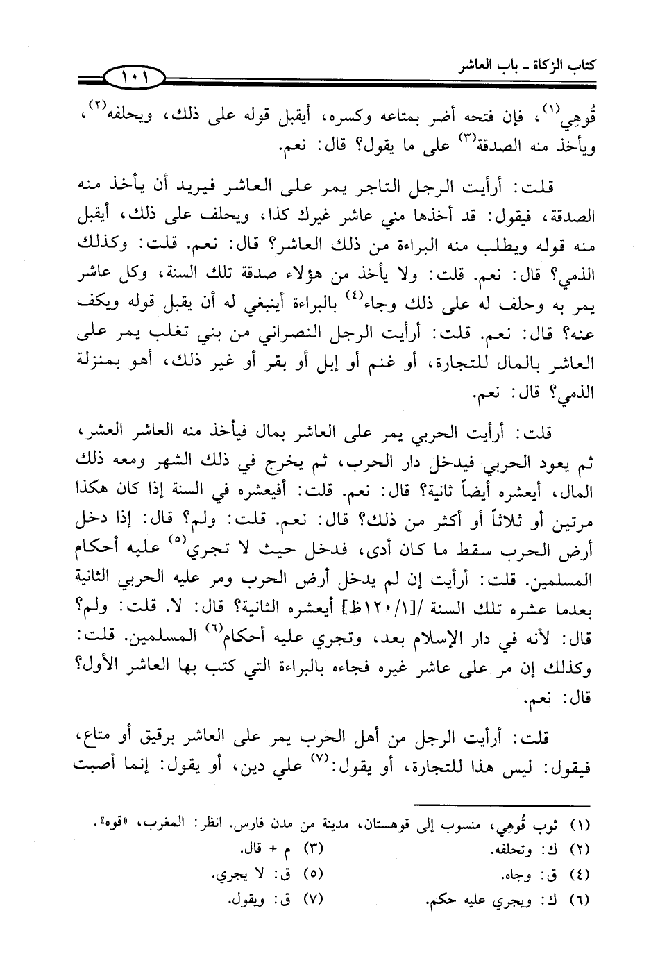 قلت: أرأيت الرجل التاجر يمر على العاشر فيريد أن يأخذ منه الصدقة، فيقول: قد أخذها مني عاشر غيرك كذا، ويحلف على ذلك، أيقبل منه قوله ويطلب منه البراءة من ذلك العاشر؟ قال: نعم. قلت: وكذلك الذمي؟ قال: نعم. قلت: ولا يأخذ من هؤلاء صدقة تلك السنة، وكل عاشر يمر به وحلف له على ذلك وجاء (¬4) بالبراءة أينبغي له أن يقبل قوله ويكف عنه؟ قال: نعم. قلت: أرأيت الرجل النصراني من بني تغلب يمر على العاشر بالمال للتجارة، أو غنم أو إبل أو بقر أو غير ذلك، أهو بمنزلة الذمي؟ قال: نعم.