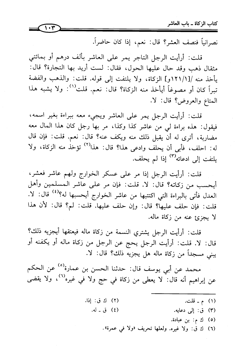 قلت: أرأيت الرجل إذا مر على عسكر الخوارج ولهم عاشر فعشر، أيحسب من زكاته؟ قال: لا. قلت: فإن مر على عاشر المسلمين وأهل العدل فأتى بالبراءة التي اكتتبها من عاشر الخوارج أيحسبها له؟ (¬4) قال: لا. قلت: فإن حلف عليها؟ قال: وإن حلف عليها. قلت: لم؟ قال: لأن هذا لا يجزئ عنه من زكاة ماله.