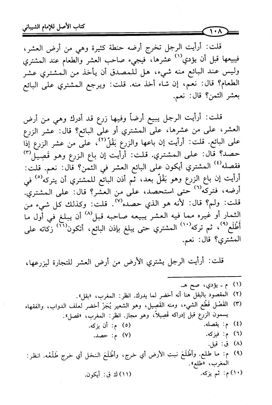 قلت: أرأيت الرجل يبيع أرضاً وفيها زرع قد أدرك وهي من أرض العشر، على من عشرها، على المشتري أو على البائع؟ قال: عشر الزرع على البائع. قلت: أرأيت إن باعها والزرع بَقْلٌ (¬2)، على من عشر الزرع إذا حصد؟ قال: على المشتري. قلت: أرأيت إن باع الزرع وهو قَصِيل (¬3) فقصله (¬4) المشتري أيكون على البائع العشر في الثمن؟ قال: نعم. قلت: أرأيت إن باع الزرع وهو بَقْلٌ بعد، ثم أذن البائع للمشتري أن يتركه (¬5) في أرضه، فتركه (¬6) حتى استحصد، على من العشر؟ قال: على المشتري. قلت: ولم؟ قال: لأنه هو الذي حصده (¬7). قلت: وكذلك كل شيء من الثمار أو غيره مما فيه العشر يبيعه صاحبه قبل (¬8) أن يبلغ في أول ما أَطْلَع (¬9)، ثم تركه (¬10) المشتري حتى يبلغ بإذن البائع، أتكون (¬11) زكاته على المشتري؟ قال: نعم.