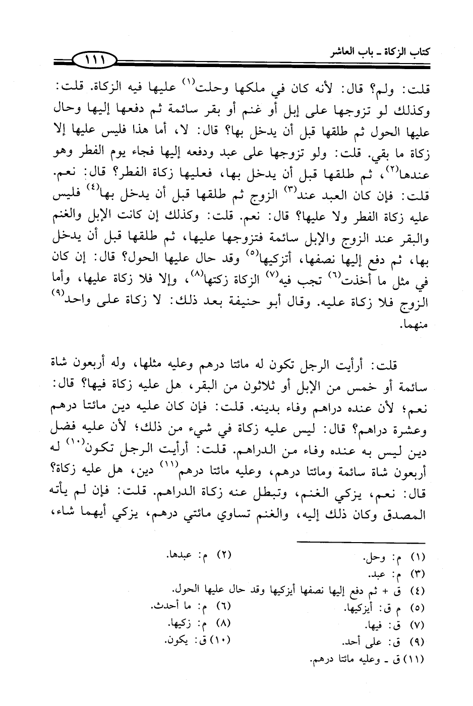 قلت: أرأيت الرجل تكون له مائتا درهم وعليه مثلها, وله أربعون شاة سائمة أو خمس من الإبل أو ثلاثون من البقر، هل عليه زكاة فيها؟ قال: نعم؛ لأن عنده دراهم وفاء بدينه. قلت: فإن كان عليه دين مائتا درهم وعشرة دراهم؟ قال: ليس عليه زكاة في شيء من ذلك؛ لأن عليه فضل دين ليس به عنده وفاء من الدراهم. قلت: أرأيت الرجل تكون (¬10) له أربعون شاة سائمة ومائتا درهم، وعليه مائتا درهم (¬11) دين، هل عليه زكاة؟ قال: نعم، يزكي الغنم، وتبطل عنه زكاة الدراهم. قلت: فإن لم يأته المصدق وكان ذلك إليه، والغنم تساوي مائتي درهم، يزكي أيهما شاء،