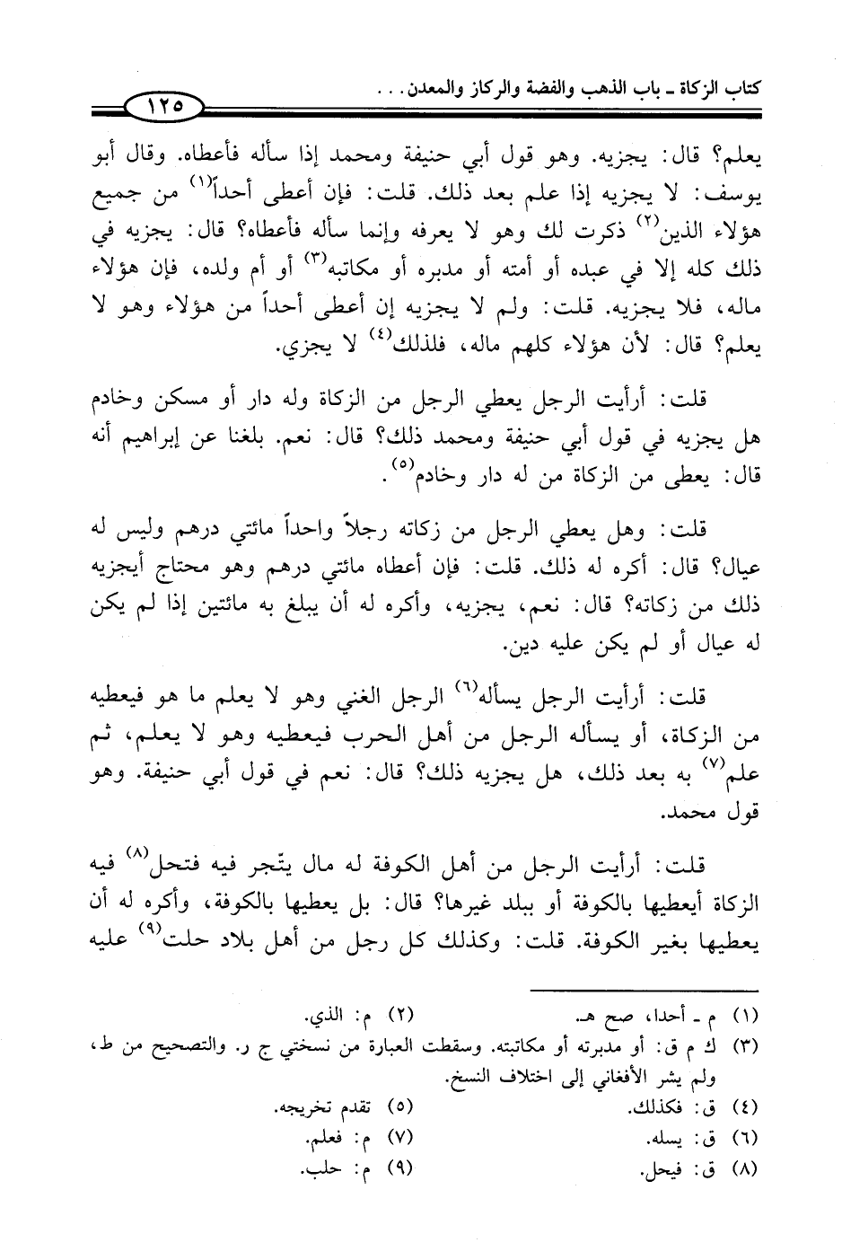 يعلم؟ قال: يجزيه. وهو قول أبي حنيفة ومحمد إذا سأله فأعطاه. وقال أبو يوسف: لا يجزيه إذا علم بعد ذلك. قلت: فإن أعطى أحداً (¬1) من جميع هؤلاء الذين (¬2) ذكرت لك وهو لا يعرفه وإنما سأله فأعطاه؟ قال: يجزيه في ذلك كله إلا في عبده أو أمته أو مدبره أو مكاتبه (¬3) أو أم ولده، فإن هؤلاء ماله، فلا يجزيه. قلت: ولم لا يجزيه إن أعطى أحداً من هؤلاء وهو لا يعلم؟ قال: لأن هؤلاء كلهم ماله، فلذلك (¬4) لا يجزي.