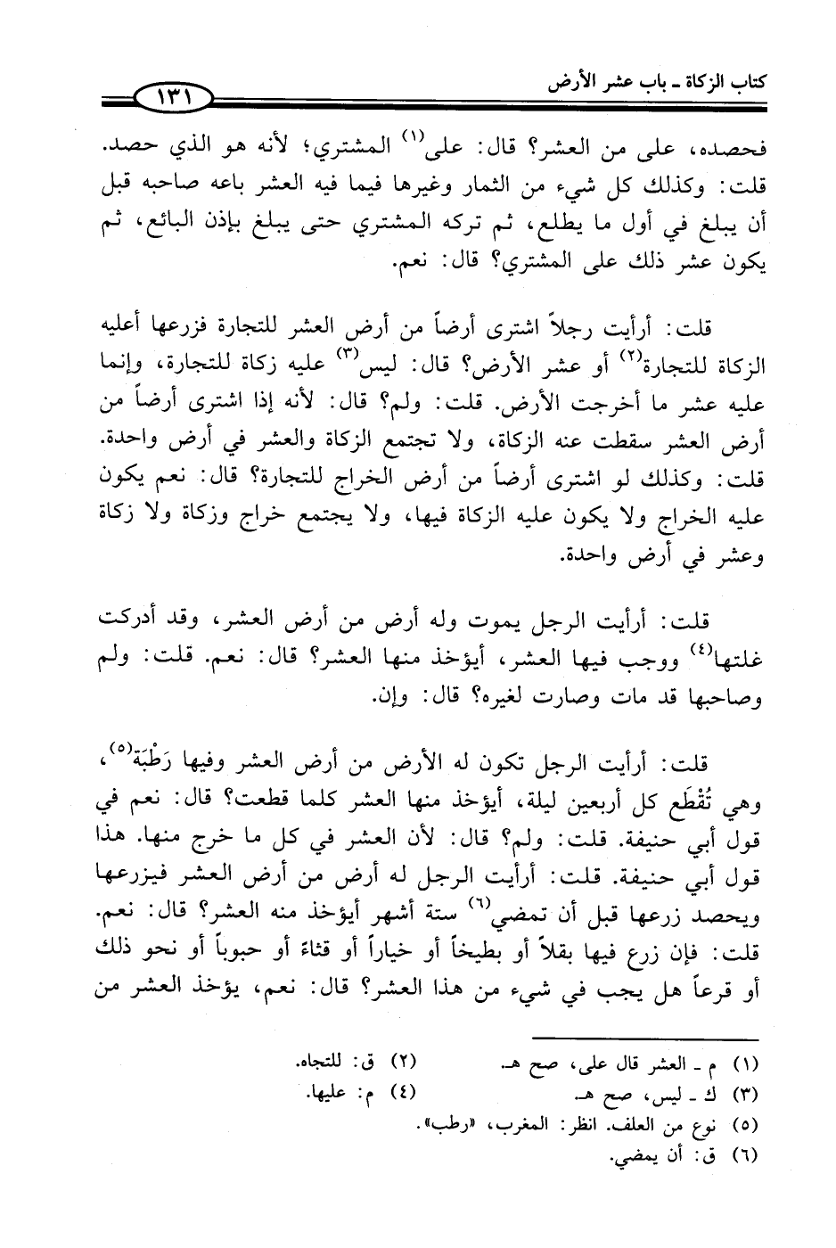 قلت: أرأيت الرجل تكون له الأرض من أرض العشر وفيها رَطْبَة (¬5)، وهي تُقْطَع كل أربعين ليلة، أيؤخذ منها العشر كلما قطعت؟ قال: نعم في قول أبي حنيفة. قلت: ولم؟ قال: لأن العشر في كل ما خرج منها. هذا قول أبي حنيفة. قلت: أرأيت الرجل له أرض من أرض العشر فيزرعها ويحصد زرعها قبل أن تمضي (¬6) ستة أشهر أيؤخذ منه العشر؟ قال: نعم. قلت: فإن زرع فيها بقلاً أو بطيخاً أو خياراً أو قثاءً أو حبوباً أو نحو ذلك أو قرعًا هل يجب في شيء من هذا العشر؟ قال: نعم، يؤخذ العشر من