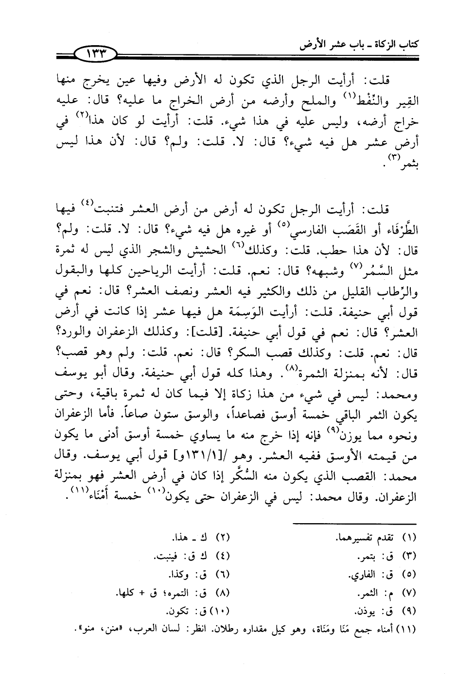 قلت: أرأيت الرجل تكون له أرض من أرض العشر فتنبت (¬4) فيها الطَّرْفَاء أو القَصَب الفارسي (¬5) أو غيره هل فيه شيء؟ قال: لا. قلت: ولى؟ قال: لأن هذا حطب. قلت: وكذلك (¬6) الحشيش والشجر الذي ليس له ثمرة مثل السَّممُر (¬7) وشبهه؟ قال: نعم. قلت: أرأيت الرياحين كلها والبقول والرِّطاب القليل من ذلك والكثير فيه العشر ونصف العشر؟ قال: نعم في قول أبي حنيفة. قلت: أرأيت الوَسِمَة هل فيها عشر إذا كانت في أرض العشر؟ قال: نعم في قول أبي حنيفة. [قلت]: وكذلك الزعفران والورد؟ قال: نعم. قلت: وكذلك قصب السكر؟ قال: نعم. قلت: ولم وهو قصب؟ قال: لأنه بمنزلة الثمرة (¬8). وهذا كله قول أبي حنيفة. وقال أبو يوسف ومحمد: ليس في شيء من هذا زكاة إلا فيما كان له ثمرة باقية، وحتى يكون الثمر الباقي خمسة أوسق فصاعداً، والوسق ستون صاعاً. فأما الزعفران ونحوه مما يوزن (¬9) فإنه إذا خرج منه ما يساوي خمسة أوسق أدنى ما يكون من قيمته الأوسق ففيه العشر. وهو قول أبي يوسف. وقال محمد: القصب الذي يكون منه السُّكَّر إذا كان في أرض العشر فهو بمنزلة الزعفران. وقال محمد: ليس في الزعفران حتى يكون (¬10) خمسة أَمْنَاء (¬11).
