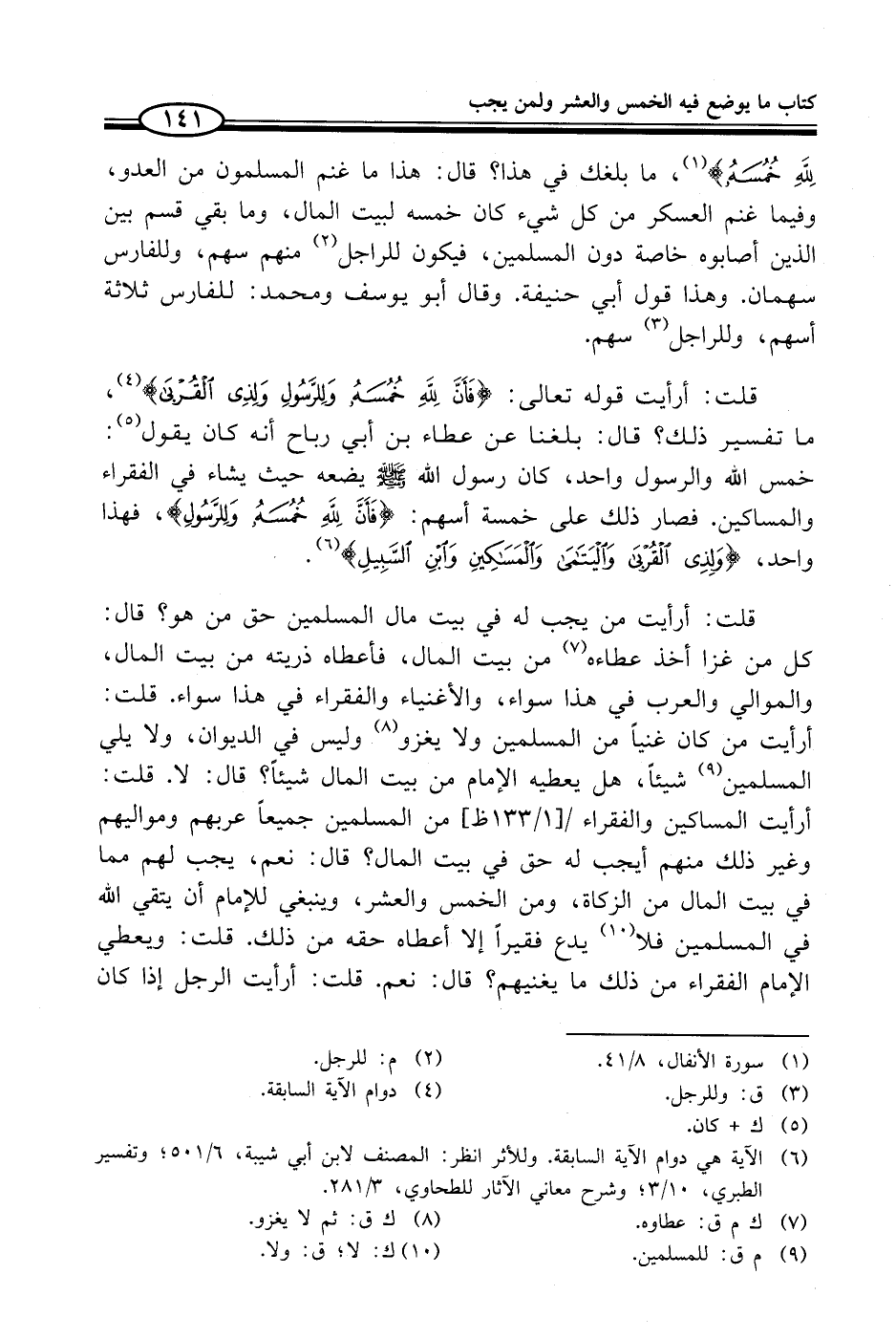 قلت: أرأيت قوله تعالى: {فَأَنَّ لِلَّهِ خُمُسَهُ وَلِلرَّسُولِ وَلِذِي الْقُرْبَى} (¬4)، ما تفسير ذلك؟ قال: بلغنا عن عطاء بن أبي رباح أنه كان يقول (¬5): خمس الله والرسول واحد، كان رسول الله - صلى الله عليه وسلم - يضعه حيث يشاء في الفقراء والمساكين. فصار ذلك على خمسة أسهم: {فَأَنَّ لِلَّهِ خُمُسَهُ وَلِلرَّسُولِ}، فهذا واحد، {وَلِذِي الْقُرْبَى وَالْيَتَامَى وَالْمَسَاكِينِ وَابْنِ السَّبِيلِ} (¬6).