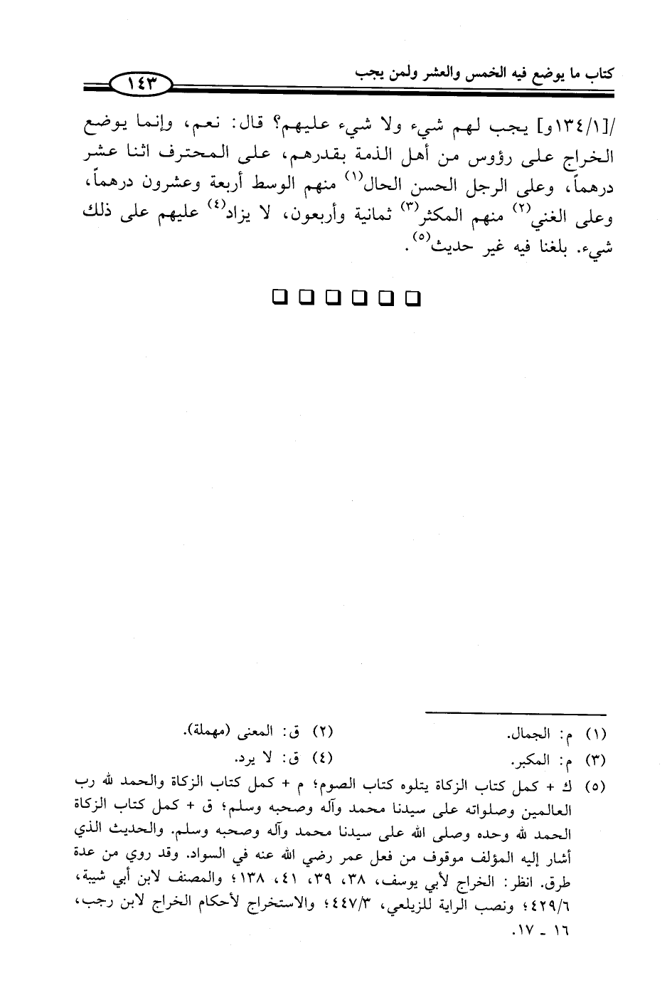 (¬5) ك + كمل كتاب الزكاة يتلوه كتاب الصوم؛ م + كمل كتاب الزكاة والحمد لله رب العالمين وصلواته على سيدنا محمد وآله وصحبه وسلم؛ ق + كمل كتاب الزكاة الحمد لله وحده وصلى الله على سيدنا محمد وآله وصحبه وسلم. والحديث الذي أشار إليه المؤلف موقوف من فعل عمر - رضي الله عنه - في السواد. وقد روي من عدة طرق. انظر: الخراج لأبي يوسف، 38، 39، 41، 138؛ والمصنف لابن أبي شيبة، 6/ 429؛ ونصب الراية للزيلعي، 3/ 447؛ والاستخراج لأحكام الخراج لابن رجب، 16 - 17.