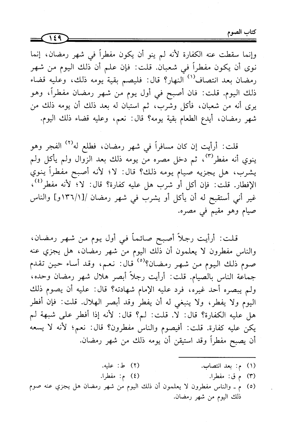قلت: أرأيت رجلاً أصبح صائماً في أول يوم من شهر رمضان، والناس مفطرون لا يعلمون أن ذلك اليوم من شهر رمضان، هل يجزي عنه صوم ذلك اليوم من شهر رمضان؟ (¬5) قال: نعم، وقد أساء حين تقدم جماعة الناس بالصيام. قلت: أرأيت رجلاً أبصر هلال شهر رمضان وحده، ولم يبصره أحد غيره، فرد عليه الإمام شهادته؟ قال: عليه أن يصوم ذلك اليوم ولا يفطر، ولا ينبغي له أن يفطر وقد أبصر الهلال. قلت: فإن أفطر هل عليه الكفارة؟ قال: لا. قلت: لم؟ قال: لأنه إذا أفطر على شبهة لم يكن عليه كفارة. قلت: أفيصوم والناس مفطرون؟ قال: نعم؛ لأنه لا يسعه أن يصبح مفطراً وقد استيقن أن يومه ذلك من شهر رمضان.