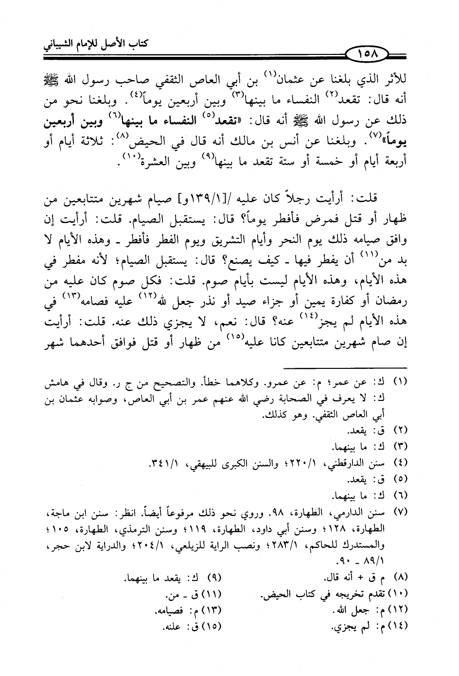 للأثر الذي بلغنا عن عثمان (¬1) بن أبي العاص الثقفي صاحب رسول الله - صلى الله عليه وسلم - أنه قال: تقعد (¬2) النفساء ما بينها (¬3) وبين أربعين يوماً (¬4). وبلغنا نحو من ذلك عن رسول الله - صلى الله عليه وسلم - أنه قال: "تقعد (¬5) النفساء ما بينها (¬6) وبين أربعين يوماً، (¬7). وبلغنا عن أنس بن مالك أنه قال في الحيض (¬8): ثلاثة أيام أو أربعة أيام أو خمسة أو ستة تقعد ما بينها (¬9) وبين العشرة (¬10).