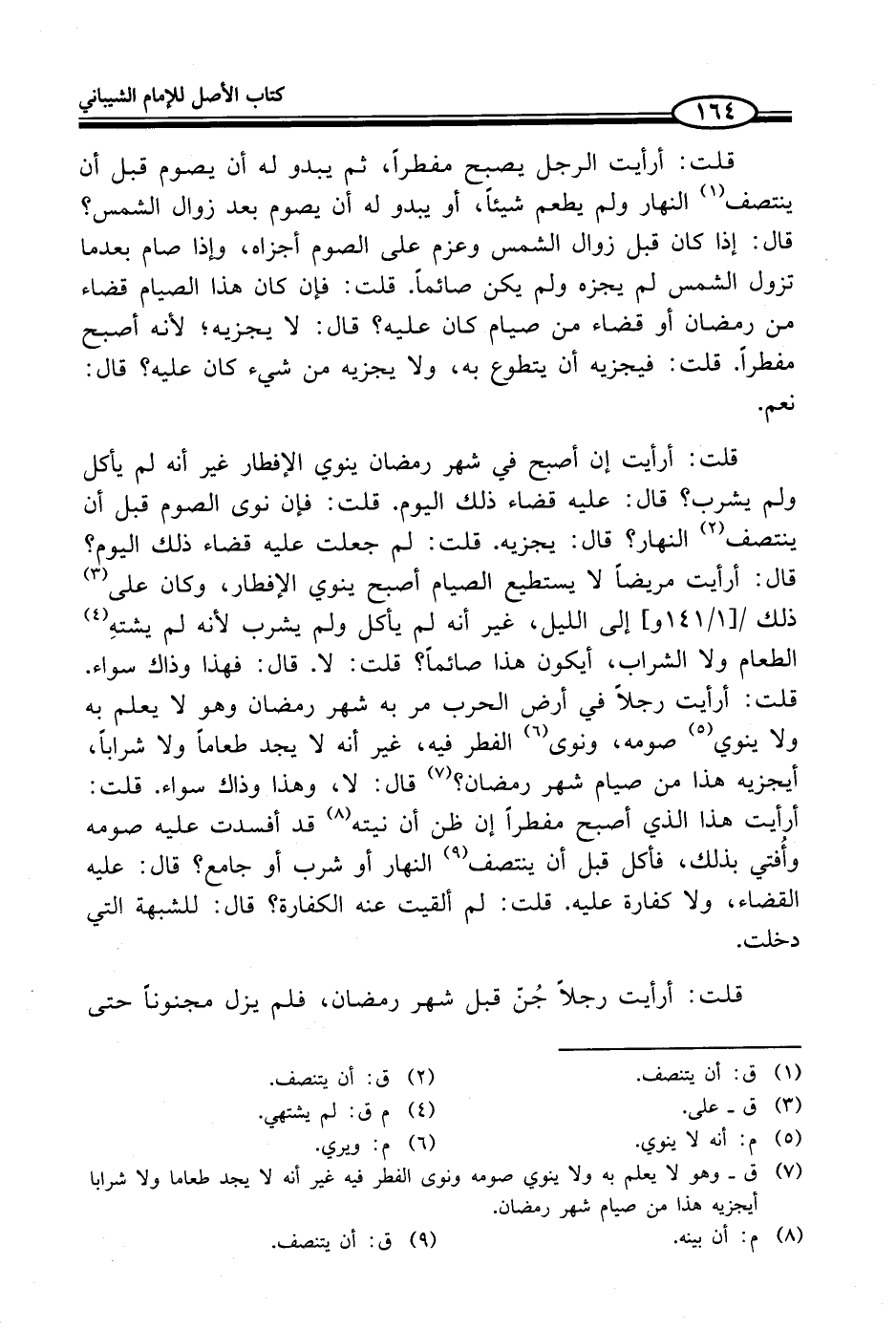 قلت: أرأيت إن أصبح في شهر رمضان ينوي الإفطار غير أنه لم يأكل ولم يشرب؟ قال: عليه قضاء ذلك اليوم. قلت: فإن نوى الصوم قبل أن ينتصف (¬2) النهار؟ قال: يجزيه. قلت: لم جعلت عليه قضاء ذلك اليوم؟ قال: أرأيت مريضاً لا يستطيع الصيام أصبح ينوي الإفطار، وكان على (¬3) ذلك إلى الليل، غير أنه لم يأكل ولم يشرب لأنه لم يشتهِ (¬4) الطعام ولا الشراب، أيكون هذا صائماً؟ قلت: لا. قال: فهذا وذاك سواء. قلت: أرأيت رجلاً في أرض الحرب مر به شهر رمضان وهو لا يعلم به ولا ينوي (¬5) صومه، ونوى (¬6) الفطر فيه، غير أنه لا يجد طعاماً ولا شراباً، أيجزيه هذا من صيام شهر رمضان؟ (¬7) قال: لا، وهذا وذاك سواء. قلت: أرأيت هذا الذي أصبح مفطراً إن ظن أن نيته (¬8) قد أفسدت عليه صومه وأُفتي بذلك، فأكل قبل أن ينتصف (¬9) النهار أو شرب أو جامع؟ قال: عليه القضاء، ولا كفارة عليه. قلت: لم ألقيت عنه الكفارة؟ قال: للشبهة التي دخلت.