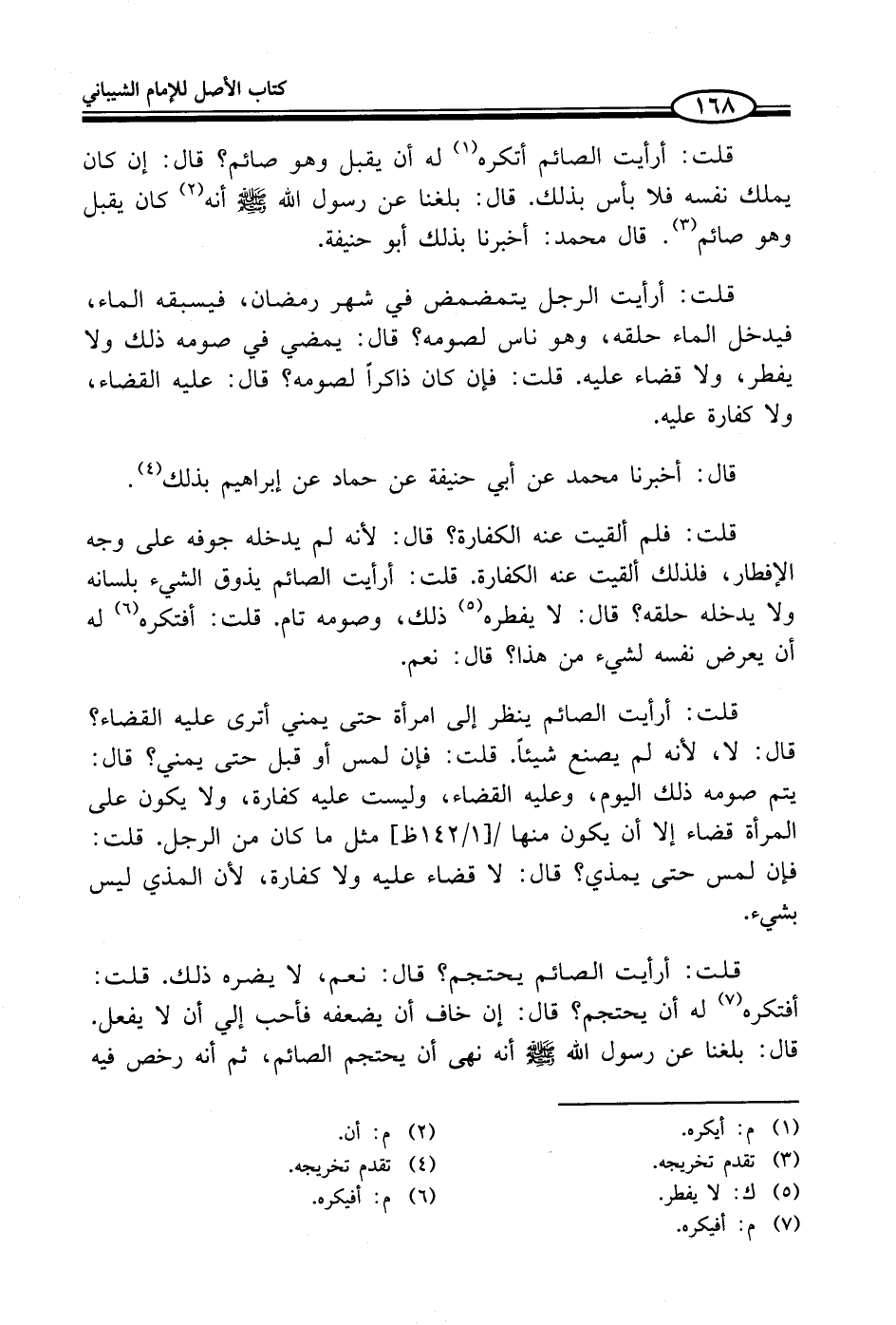 قلت: أرأيت الصائم يحتجم؟ قال: نعم، لا يضره ذلك. قلت: أفتكره (¬7) له أن يحتجم؟ قال: إن خاف أن يضعفه فأحب إلي أن لا يفعل. قال: بلغنا عن رسول الله - صلى الله عليه وسلم - أنه نهى أن يحتجم الصائم، ثم أنه رخص فيه