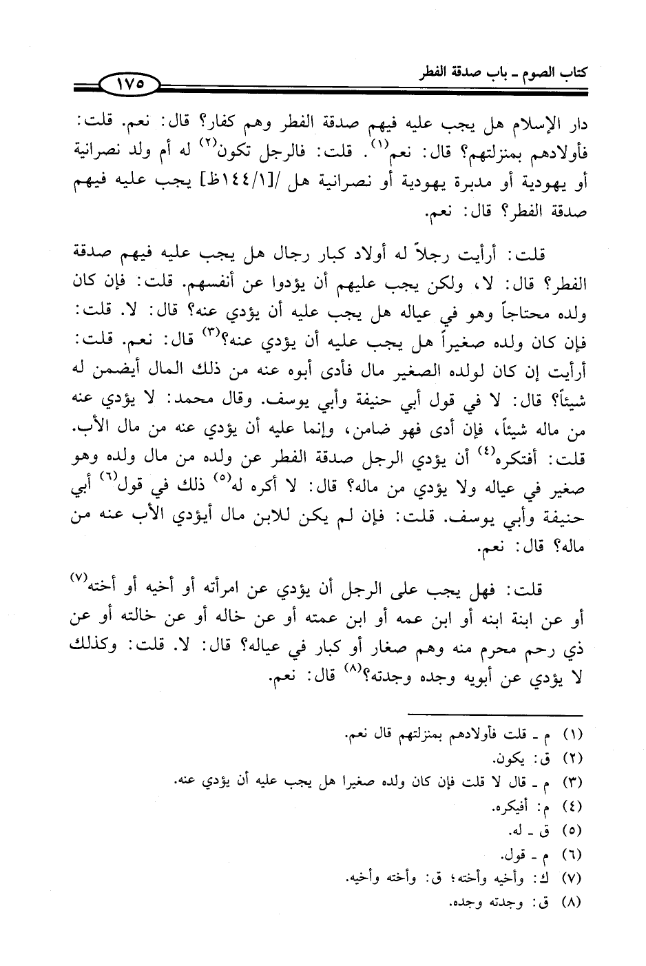 قلت: فهل يجب على الرجل أن يؤدي عن امرأته أو أخيه أو أخته (¬7) أو عن ابنة ابنه أو ابن عمه أو ابن عمته أو عن خاله أو عن خالته أو عن ذي رحم محرم منه وهم صغار أو كبار في عياله؟ قال: لا. قلت: وكذلك لا يؤدي عن أبويه وجده وجدته؟ (¬8) قال: نعم.