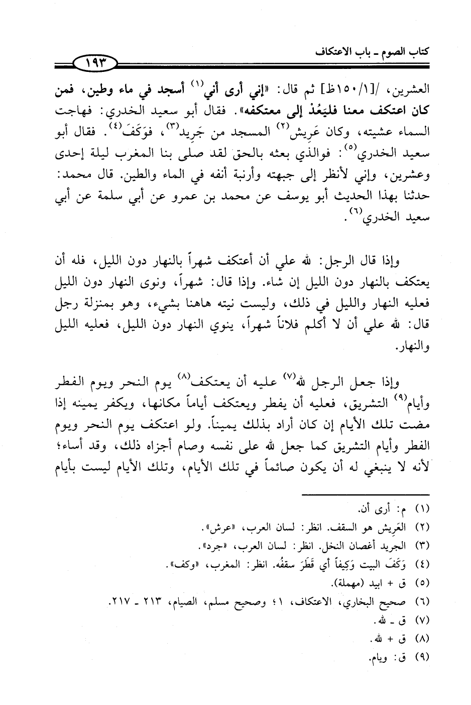 العشرين، ثم قال: "إني أرى أني (¬1) أسجد في ماء وطين، فمن كان اعتكف معنا فليَعُدْ إلى معتكفه". فقال أبو سعيد الخدري: فهاجت السماء عشيته، وكان عَرِيش (¬2) المسجد من جَرِيد (¬3)، فوَكَفَ (¬4). فقال أبو سعيد الخدري (¬5): فوالذي بعثه بالحق ص لقد صلى بنا المغرب ليلة إحدى وعشرين، وإني لأنظر إلى جبهته وأرنبة أنفه في الماء والطين. قال محمد: حدثنا بهذا الحديث أبو يوسف عن محمد بن عمرو عن أبي سلمة عن أبي سعيد الخدري (¬6).