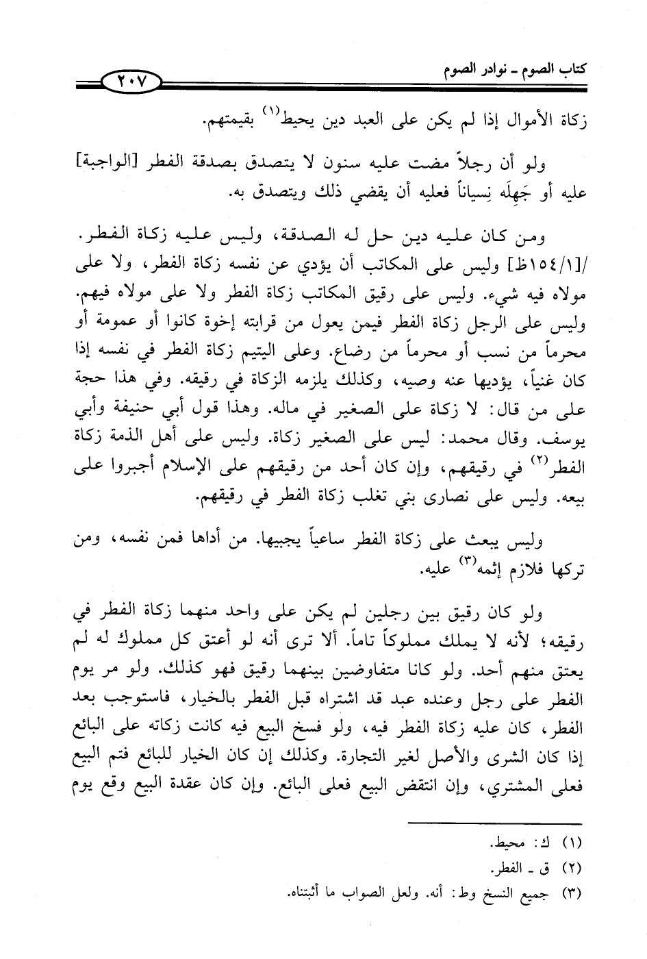 ومن كان عليه دين حل له الصدقة، وليس عليه زكاة الفطر. وليس على المكاتب أن يؤدي عن نفسه زكاة الفطر، ولا على مولاه فيه شيء. وليس على رقيق المكاتب زكاة الفطر ولا على مولاه فيهم. وليس على الرجل زكاة الفطر فيمن يعول من قرابته إخوة كانوا أو عمومة أو محرماً من نسب أو محرماً من رضاع. وعلى اليتيم زكاة الفطر في نفسه إذا كان غنياً، يؤديها عنه وصيه، وكذلك يلزمه الزكاة في رقيقه. وفي هذا حجة على من قال: لا زكاة على الصغير في ماله. وهذا قول أبي حنيفة وأبي يوسف. وقال محمد: ليس على الصغير زكاة. وليس على أهل الذمة زكاة الفطر (¬2) في رقيقهم، وإن كان أحد من رقيقهم على الإسلام أجبروا على بيعه. وليس على نصارى بني تغلب زكاة الفطر في رقيقهم.