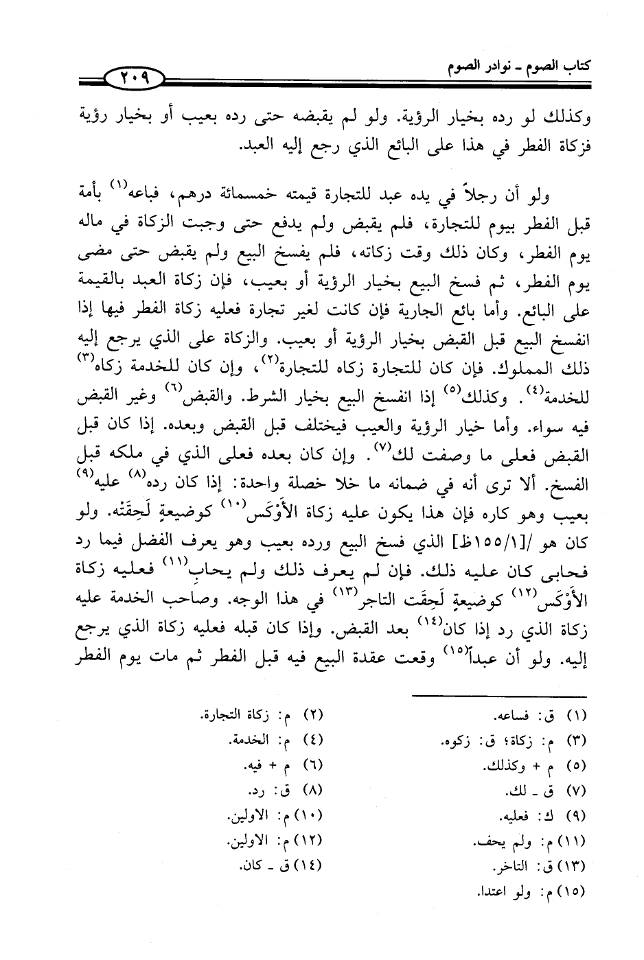 ولو أن رجلاً في يده عبد للتجارة قيمته خمسمائة درهم، فباعه (¬1) بأمة قبل الفطر بيوم للتجارة، فلم يقبض ولم يدفع حتى وجبت الزكاة في ماله يوم الفطر، وكان ذلك وقت زكاته، فلم يفسخ البيع ولم يقبض حتى مضى يوم الفطر، ثم فسخ البيع بخيار الرؤية أو بعيب، فإن زكاة العبد بالقيمة على البائع. وأما بائع الجارية فإن كانت لغير تجارة فعليه زكاة الفطر فيها إذا انفسخ البيع قبل القبض بخيار الرؤية أو بعيب. والزكاة على الذي يرجع إليه ذلك المملوك. فإن كان للتجارة زكاه للتجارة (¬2)، وإن كان للخدمة زكاه (¬3) للخدمة (¬4). وكذلك (¬5) إذا انفسخ البيع بخيار الشرط. والقبض (¬6) وغير القبض فيه سواء. وأما خيار الرؤية والعيب فيختلف قبل القبض وبعده. إذا كان قبل القبض فعلى ما وصفت لك (¬7). وإن كان بعده فعلى الذي في ملكه قبل الفسخ. ألا ترى أنه في ضمانه ما خلا خصلة واحدة: إذا كان رده (¬8) عليه (¬9) بعيب وهو كاره فإن هذا يكون عليه زكاة الأَوْكَس (¬10) كوضيعةٍ لَحِقَتْه. ولو كان هو الذي فسخ البيع ورده بعيب وهو يعرف الفضل فيما رد فحابى كان عليه ذلك. فإن لم يعرف ذلك ولم يحاب (¬11) فعليه زكاة الأَوْكَس (¬12) كوضيعةٍ لَحِقَت التاجر (¬13) في هذا الوجه. وصاحب الخدمة عليه زكاة الذي رد إذا كان (¬14) بعد القبض. وإذا كان قبله فعليه زكاة الذي يرجع إليه. ولو أن عبداً (¬15) وقعت عقدة البيع فيه قبل الفطر ثم مات يوم الفطر