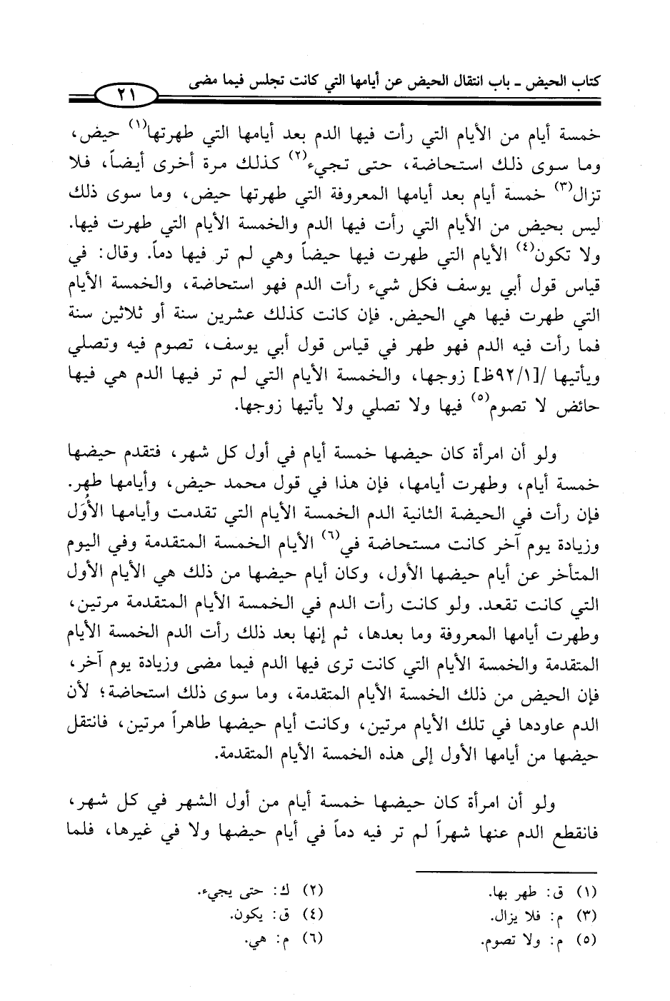 ولو أن امرأة كان حيضها خمسة أيام في أول كل شهر، فتقدم حيضها خمسة أيام، وطهرت أيامها، فإن هذا في قول محمد حيض، وأيامها طهر. فإن رأت في الحيضة الثانية الدم الخمسة الأيام التي تقدمت وأيامها الأُوَل وزيادة يوم آخر كانت مستحاضة في (¬6) الأيام الخمسة المتقدمة وفي اليوم المتأخر عن أيام حيضها الأول، وكان أيام حيضها من ذلك هي الأيام الأول التي كانت تقعد. ولو كانت رأت الدم في الخمسة الأيام المتقدمة مرتين، وطهرت أيامها المعروفة وما بعدها، ثم إنها بعد ذلك رأت الدم الخمسة الأيام المتقدمة والخمسة الأيام التي كانت ترى فيها الدم فيما مضى وزيادة يوم آخر، فإن الحيض من ذلك الخمسة الأيام المتقدمة، وما سوى ذلك استحاضة؛ لأن الدم عاودها في تلك الأيام مرتين، وكانت أيام حيضها طاهراً مرتين، فانتقل حيضها من أيامها الأول إلى هذه الخمسة الأيام المتقدمة.