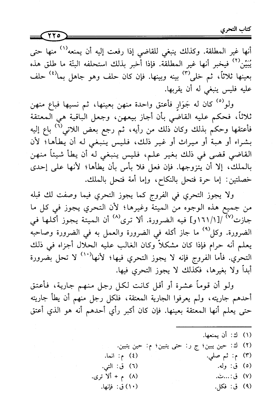 ولو أن قوماً عشرة أو أقل كانت لكل رجل منهم جارية، فأعتق أحدهم جاريته، ولم يعرفوا الجارية المعتقة، فلكل رجل منهم أن يطأ جاريته حتى يعلم أنها المعتقة بعينها. فإن كان أكبر رأي أحدهم أنه هو الذي أعتق