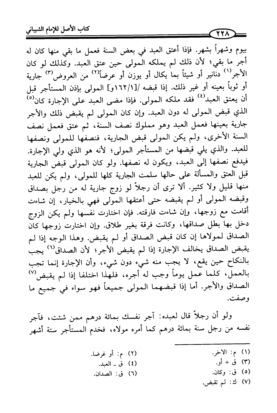 بيوم وشهراً بشهر. فإذا أعتق العبد في بعض السنة فعمل ما بقي منها كان له أجر ما بقي؛ لأن ذلك لم يملكه المولى حين عتق العبد. وكذلك لو كان الأجر (¬1) دنانير أو شيئاً بما يكال أو يوزن أو عرضاً (¬2) من العروض (¬3) جارية أو ثوبًا بعينه أو غير ذلك. إذا قبضه المولى بإذن المستأجر قبل أن يعتق العبد (¬4) فقد ملكه المولى. فإذا مضى العبد على الإجارة كان (¬5) الذي قبض المولى له دون العبد. وإن كان المولى لم يقبض ذلك والأجر جارية بعينها فعمل العبد وهو مملوك نصف السنة، ثم عتق فعمل نصف السنة الأخرى، ولم يكن المولى قبض الجارية، فنصفها للمولى ونصفها للعبد. والذي يلي قبضها من المستأجر المولى؛ لأنه هو الذي ولي الإجارة. فيدفع نصفها إلى العبد، ويكون له نصفها. ولو كان المولى قبض الجارية قبل العتق والمسألة على حالها سلمت الجارية كلها للمولى، ولم يكن للعبد منها قليل ولا كثير. ألا ترى أن رجلاً لو زوج جارية له من رجل بصداق وقبضه المولى أو لم يقبضه حتى أعتقها المولى فهي بالخيار، إن شاءت أقامت مع زوجها، وإن شاءت فارقته. فإن اختارت نفسها ولم يكن الزوج دخل بها بطل صداقها، وكانت فرقة بغير طلاق. وإن اختارت زوجها كان الصداق لمولاها إن كان قبض الصداق أو لم يقبض. وهذا الوجه إذا لم يقبض الصداق يخالف الإجارة إذا لم يقبض الأجر؛ لأن الصداق (¬6) يجب بالنكاح حين يقع، لا يجب منه شيء دون شيء، وأن الإجارة إنما تجب بالعمل، كلما عمل يوماً وجب له أجره، فلهذا اختلفا إذا لم يقبض (¬7) الصداق والأجر. أما إذا قبضهما المولى جميعاً فهو سواء في جميع ما وصفت.