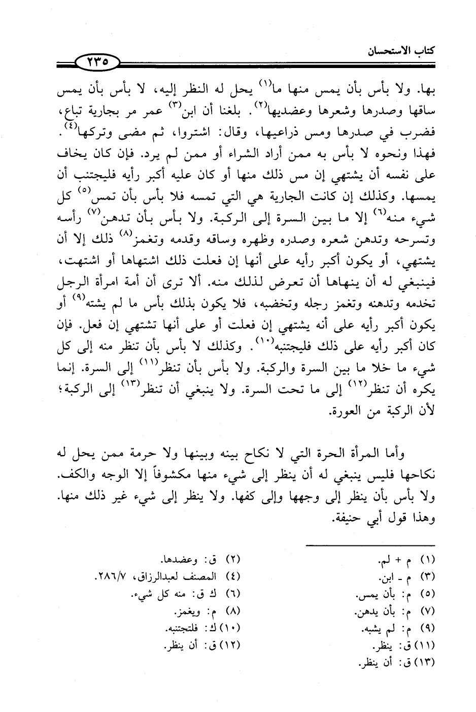بها. ولا بأس بأن يمس منها ما (¬1) يحل له النظر إليه، لا بأس بأن يمس ساقها وصدرها وشعرها وعضديها (¬2). بلغنا أن ابن (¬3) عمر مر بجارية تباع، فضرب في صدرها ومس ذراعيها، وقال: اشتروا، ثم مضى وتركها (¬4). فهذا ونحوه لا بأس به ممن أراد الشراء أو ممن لم يرد. فإن كان يخاف على نفسه أن يشتهي إن مس ذلك منها أو كان عليه أكبر رأيه فليجتنب أن يمسها. وكذلك إن كانت الجارية هي التي تمسه فلا بأس بأن تمس (¬5) كل شيء منه (¬6) إلا ما بين السرة إلى الركبة. ولا بأس بأن تدهن (¬7) رأسه وتسرحه وتدهن شعره وصدره وظهره وساقه وقدمه وتغمز (¬8) ذلك إلا أن يشتهي، أو يكون أكبر رأيه على أنها إن فعلت ذلك اشتهاها أو اشتهت، فينبغي له أن ينهاها أن تعرض لذلك منه. ألا ترى أن أمة امرأة الرجل تخدمه وتدهنه وتغمز رجله وتخضبه، فلا يكون بذلك بأس ما لم يشته (¬9) أو يكون أكبر رأيه على أنه يشتهي إن فعلت أو على أنها تشتهي إن فعل. فإن كان أكبر رأيه على ذلك فليجتنبه (¬10). وكذلك لا بأس بأن تنظر منه إلى كل شيء ما خلا ما بين السرة والركبة. ولا بأس بأن تنظر (¬11) إلى السرة. إنما يكره أن تنظر (¬12) إلى ما تحت السرة. ولا ينبغي أن تنظر (¬13) إلى الركبة؛ لأن الركبة من العورة.