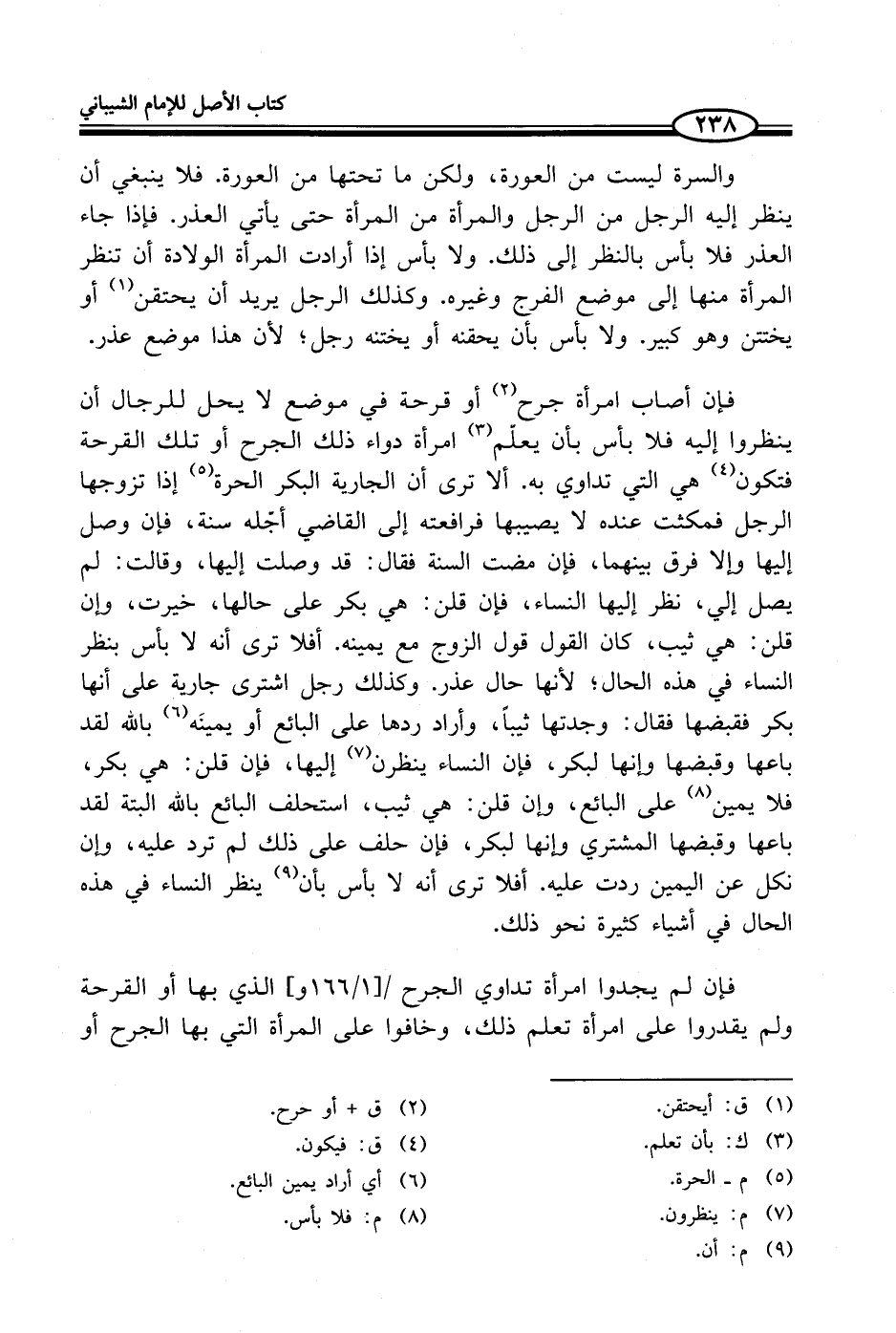 فإن أصاب امرأة جرح (¬2) أو قرحة في موضع لا يحل للرجال أن ينظروا إليه فلا بأس بأن يعلّم (¬3) امرأة دواء ذلك الجرح أو تلك القرحة فتكون (¬4) هي التي تداوي به. ألا ترى أن الجارية البكر الحرة (¬5) إذا تزوجها الرجل فمكثت عنده لا يصيبها فرافعته إلى القاضي أجّله سنة، فإن وصل إليها وإلا فرق بينهما، فإن مضت السنة فقال: قد وصلت إليها، وقالت: لم يصل إلي، نظر إليها النساء، فإن قلن: هي بكر على حالها، خيرت، وان قلن: هي ثيب، كان القول قول الزوج مع يمينه. أفلا ترى أنه لا بأس بنظر النساء في هذه الحال؛ لأنها حال عذر. وكذلك رجل اشترى جارية على أنها بكر فقبضها فقال: وجدتها ثيباً، وأراد ردها على البائع أو يمينَه (¬6) بالله لقد باعها وقبضها وإنها لبكر، فإن النساء ينظرن (¬7) إليها، فإن قلن: هي بكر، فلا يمين (¬8) على البائع، وإن قلن: هي ثيب، استحلف البائع بالله البتة لقد باعها وقبضها المشتري وإنها لبكر، فإن حلف على ذلك لم ترد عليه، وإن نكل عن اليمين ردت عليه. أفلا ترى أنه لا بأس بأن (¬9) ينظر النساء في هذه الحال في أشياء كثيرة نحو ذلك.