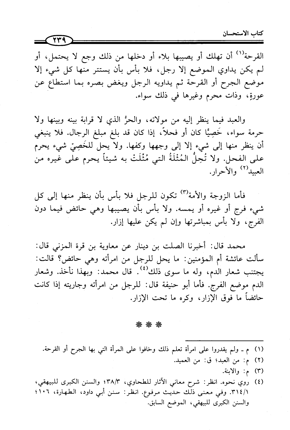 والعبد فيما ينظر إليه من مولاته، والحرُّ الذي لا قرابة بينه وبينها ولا حرمة سواء، خَصِيًّا كان أو فحلاً، إذا كان قد بلغ مبلغ الرجال. فلا ينبغي أن ينظر منها إلى شيء إلا إلى وجهها وكفها. ولا يحل للخَصِيّ شيء يحرم على الفحل. ولا تُحِلُّ المُثْلَةُ التي مُثِّلَتْ به شيئاً يحرم على غيره من العبيد (¬2) والأحرار.