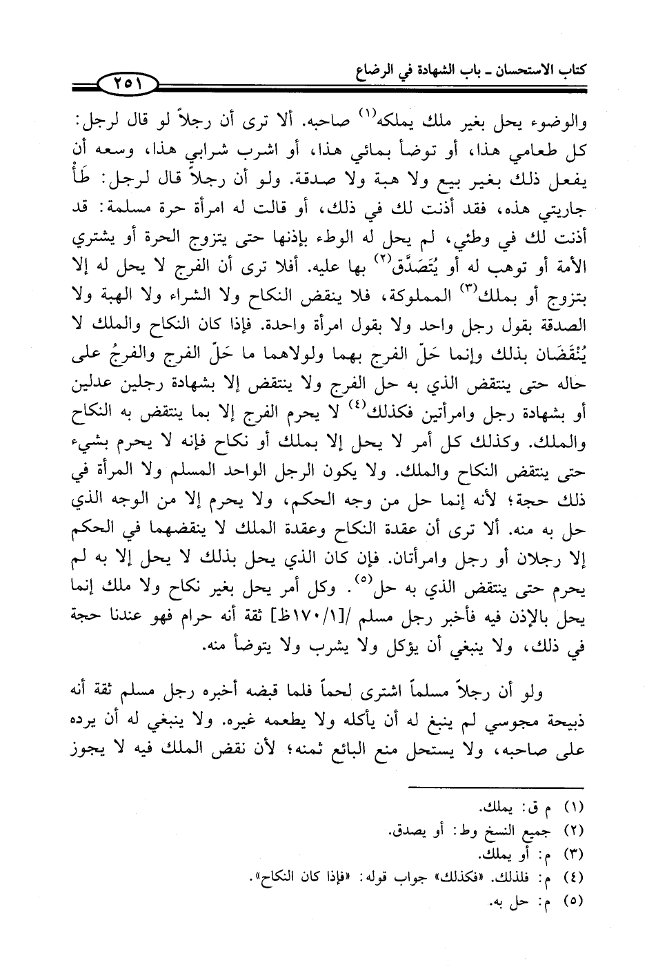 والوضوء يحل بغير ملك يملكه (¬1) صاحبه. ألا ترى أن رجلاً لو قال لرجل: كل طعامي هذا، أو توضأ بمائي هذا، أو اشرب شرابي هذا، وسعه أن يفعل ذلك بغير بيع ولا هبة ولا صدقة. ولو أن رجلاً قال لرجل: طَأْ جاريتي هذه، فقد أذنت لك في ذلك، أو قالت له امرأة حرة مسلمة: قد أذنت لك في وطئي، لم يحل له الوطء بإذنها حتى يتزوج الحرة أو يشتري الأمة أو توهب له أو يُتَصَدَّق (¬2) بها عليه. أفلا ترى أن الفرج لا يحل له إلا بتزوج أو بملك (¬3) المملوكة، فلا ينقض النكاح ولا الشراء ولا الهبة ولا الصدقة بقول رجل واحد ولا بقول امرأة واحدة. فإذا كان النكاح والملك لا يُنْقَضَان بذلك وإنما حَلّ الفرج بهما ولولاهما ما حَلّ الفرج والفرجُ على حاله حتى ينتقض الذي به حل الفرج ولا ينتقض إلا بشهادة رجلين عدلين أو بشهادة رجل وامرأتين فكذلك (¬4) لا يحرم الفرج إلا بما ينتقض به النكاح والملك. وكذلك كل أمر لا يحل إلا بملك أو نكاح فإنه لا يحرم بشيء حتى ينتقض النكاح والملك. ولا يكون الرجل الواحد المسلم ولا المرأة في ذلك حجة؛ لأنه إنما حل من وجه الحكم، ولا يحرم إلا من الوجه الذي حل به منه. ألا ترى أن عقدة النكاح وعقدة الملك لا ينقضهما في الحكم إلا رجلان أو رجل وامرأتان. فإن كان الذي يحل بذلك لا يحل إلا به لى يحرم حتى ينتقض الذي به حل (¬5). وكل أمر يحل بغير نكاح ولا ملك إنما يحل بالإذن فيه فأخبر رجل مسلم ثقة أنه حرام فهو عندنا حجة في ذلك، ولا ينبغي أن يؤكل ولا يشرب ولا يتوضأ منه.