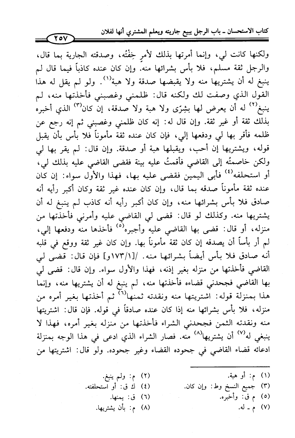 ولكنها كانت لي، وإنما أمرتها بذلك لأمرٍ خِفْتُه، وصدقته الجارية بما قال، والرجل ثقة مسلم، فلا بأس بشرائها منه. وإن كان عنده كاذباً فيما قال لم ينبغ له أن يشتريها منه ولا يقبضها صدقة ولا هبة (¬1). ولو لم يقل له هذا القول الذي وصفت لك ولكنه قال: ظلمني وغصبني فأخذتها منه، لم ينبغ (¬2) له أن يعرض لها بشِرًى ولا هبة ولا صدقة، إن كان (¬3) الذي أخبره بذلك ثقة أو غير ثقة. وإن قال له: إنه كان ظلمني وغصبني ثم إنه رجع عن ظلمه فأقر بها لي ودفعها إلي، فإن كان عنده ثقة مأموناً فلا بأس بأن يقبل قوله، ويشتريها إن أحب، ويقبلها هبة أو صدقة. صان قال: لم يقر بها لي ولكن خاصمتُه إلى القاضي فأقمتُ عليه بينة فقضى القاضي عليه بذلك لي، أو استحلفه (¬4) فأبى اليمين فقضى عليه بها، فهذا والأول سواء: إن كان عنده ثقة مأموناً صدقه بما قال، صان كان عنده غير ثقة وكان أكبر رأيه أنه صادق فلا بأس بشرائها منه، وإن كان أكبر رأيه أنه كاذب لم ينبغ له أن يشتريها منه. وكذلك لو قال: قضى لي القاضي عليه وأمرني فأخذتها من منزله، أو قال: قضى بها القاضي عليه وأجبره (¬5) فأخذها منه ودفعها إلي، لم أر بأساً أن يصدقه إن كان ثقة مأموناً بها. وإن كان غير ثقة ووقع في قلبه أنه صادق فلا بأس أيضاً بشرائها منه. فإن قال: قضى لي القاضي فأخذتها من منزله بغير إذنه، فهذا والأول سواء. وإن قال: قضى لي بها القاضي فجحدني قضاءه فأخذتها منه، لم ينبغ له أن يشتريها منه، وإنما هذا بمنزلة قوله: اشتريتها منه ونقدته ثمنها (¬6) ثم أخذتها بغير أمره من منزله، فلا بأس بشرائها منه إذا كان عنده صادقاً في قوله. فإن قال: اشتريتها منه ونقدته الثمن فجحدني الشراء فأخذتها من منزله بغير أمره، فهذا لا ينبغي له (¬7) أن يشتريها (¬8) منه. فصار الشراء الذي ادعى في هذا الوجه بمنزلة ادعائه قضاء القاضي في جحوده القضاء وغير جحوده. ولو قال: اشتريتها من