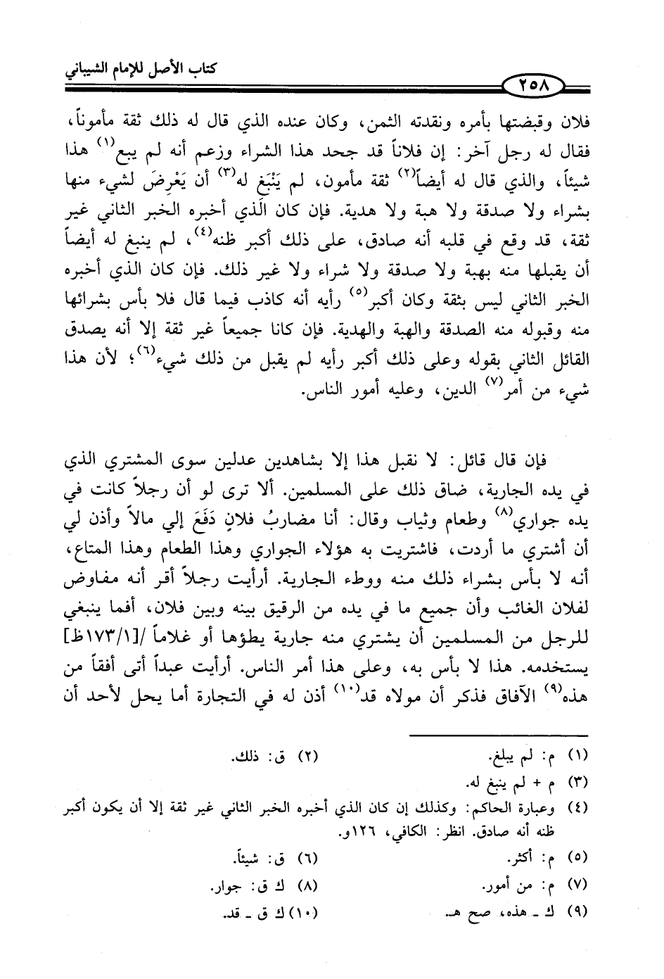 فإن قال قائل: لا نقبل هذا إلا بشاهدين عدلين سوى المشتري الذي في يده الجارية، ضاق ذلك على المسلمين. ألا ترى لو أن رجلاً كانت في يده جواري (¬8) وطعام وثياب وقال: أنا مضاربُ فلانٍ دَفَعَ إلي مالاً وأذن لي أن أشتري ما أردت، فاشتريت به هؤلاء الجواري وهذا الطعام وهذا المتاع، أنه لا بأس بشراء ذلك منه ووطء الجارية. أرأيت رجلاً أقر أنه مفاوض لفلان الغائب وأن جميع ما في يده من الرقيق بينه وبين فلان، أفما ينبغي للرجل من المسلمين أن يشتري منه جارية يطؤها أو غلاماً يستخدمه. هذا لا بأس به، وعلى هذا أمر الناس. أرأيت عبداً أتى أفقاً من هذه (¬9) الآفاق فذكر أن مولاه قد (¬10) أذن له في التجارة أما يحل لأحد أن