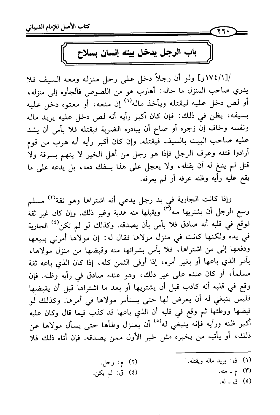 ولو أن رجلاً دخل على رجل منزله ومعه السيف فلا يدري صاحب المنزل ما حاله: أهارب هو من اللصوص فألجأوه إلى منزله، أو لص دخل عليه ليقتله ويأخذ ماله (¬1) إن منعه، أو معتوه دخل عليه بسيفه، يظن في ذلك: فإن كان أكبر رأيه أنه لص دخل عليه يريد ماله ونفسه وخاف إن زجره أو صاح أن يبادره الضربة فيقتله فلا بأس أن يشد عليه صاحب البيت بالسيف فيقتله. وإن كان أكبر رأيه أنه هرب من قوم أرادوا قتله وعرف الرجل فإذا هو رجل من أهل الخير لا يتهم بسرقة ولا قتل لم ينبغ له أن يقتله، ولا يعجل على هذا بسفك دمه، بل يدعه على ما يقع عليه رأيه وظنه عرفه أو لم يعرفه.