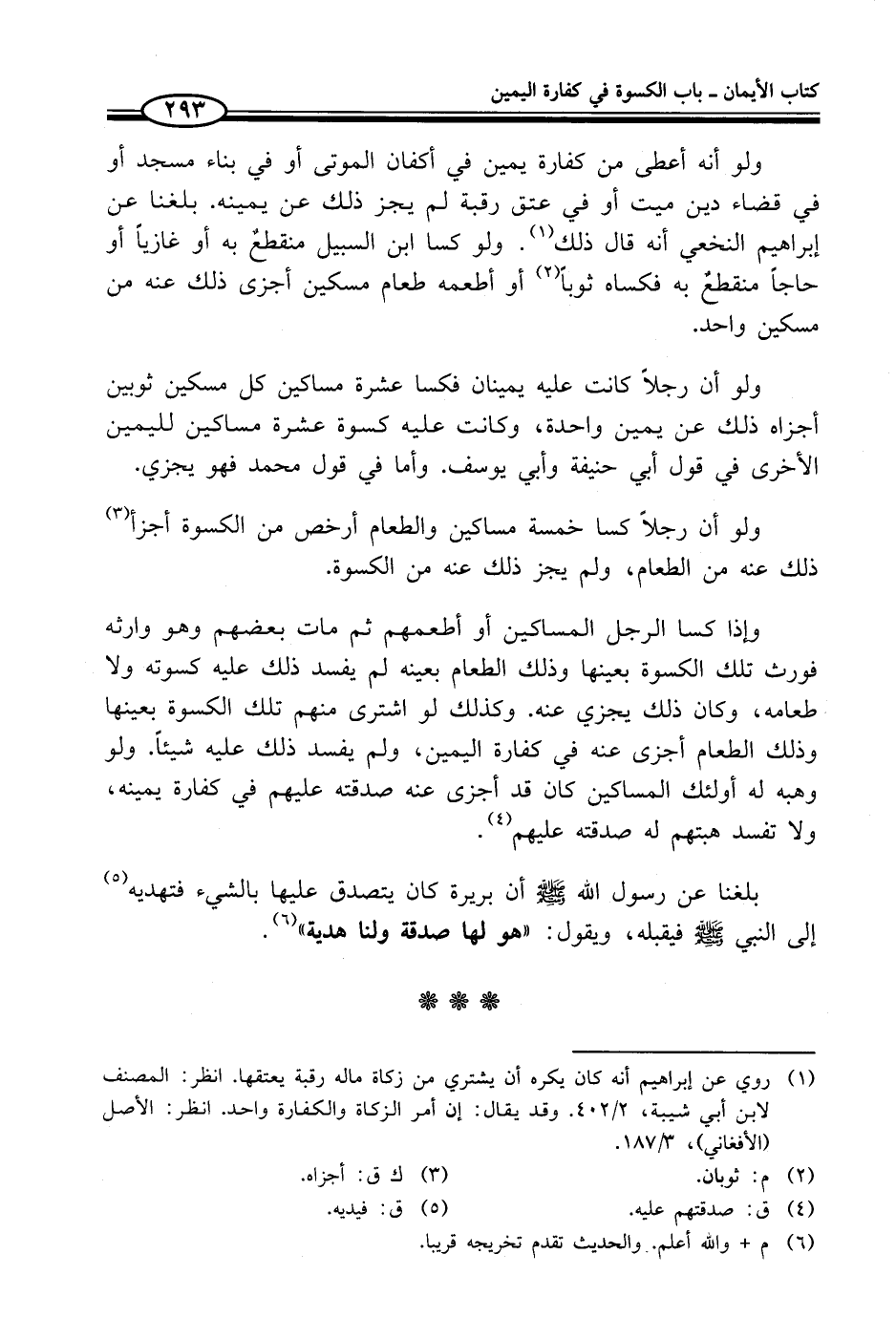 وإذا كسا الرجل المساكين أو أطعمهم ثم مات بعضهم وهو وارثه فورث تلك الكسوة بعينها وذلك الطعام بعينه لم يفسد ذلك عليه كسوته ولا طعامه، وكان ذلك يجزي عنه. وكذلك لو اشترى منهم تلك الكسوة بعينها وذلك الطعام أجزى عنه في كفارة اليمين، ولم يفسد ذلك عليه شيئاً. ولو وهبه له أولئك المساكين كان قد أجزى عنه صدقته عليهم في كفارة يمينه، ولا تفسد هبتهم له صدقته عليهم (¬4).