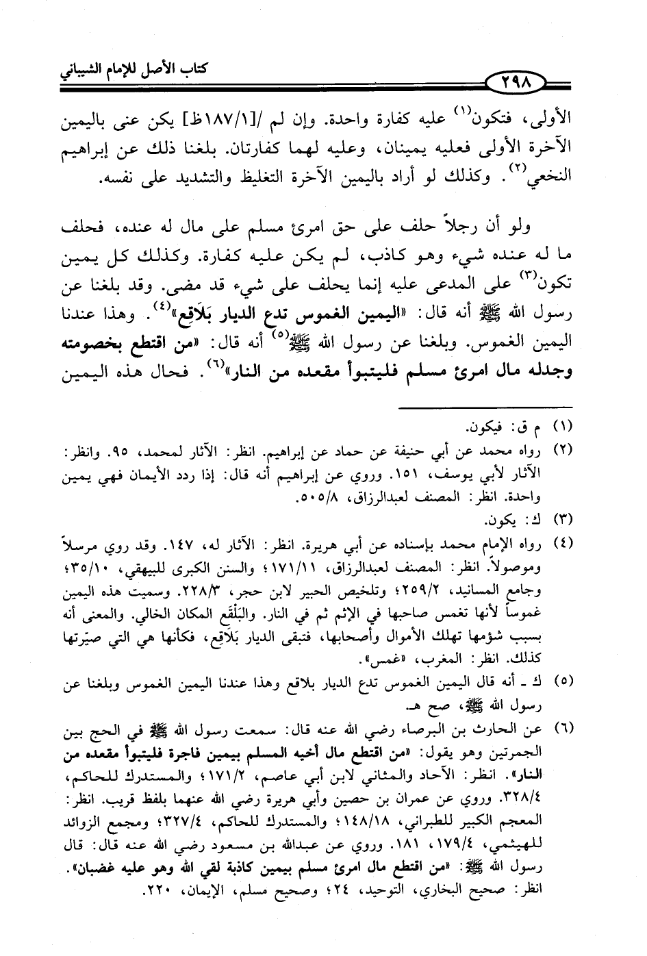 (¬4) رواه الإمام محمد بإسناده عن أبي هريرة. انظر: الآثار له، 147. وقد روي مرسلاً وموصولًا. انظر: المصنف لعبد الرزاق، 11/ 171؛ والسنن الكبرى للبيهقي، 10/ 35؛ وجامع المسانيد، 2/ 259؛ وتلخيص الحبير لابن حجر، 3/ 228. وسميت هذه اليمين غموسًا لأنها تغمس صاحبها في الإثم ثم في النار. والبَلْقَعِ المكان الخالي. والمعنى أنه بسبب شؤمها تهلك الأموال وأصحابها، فتبقى الديار بَلاقِع، فكأنها هي التي صيّرتها كذلك. انظر: المغرب، "غمس".
