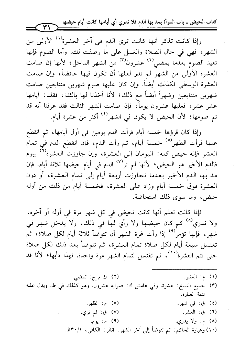 (¬10) وعبارة الحاكم: ثم تتوضأ إلى آخر الشهر. انظر: الكافي، 1/ 30 ظ.