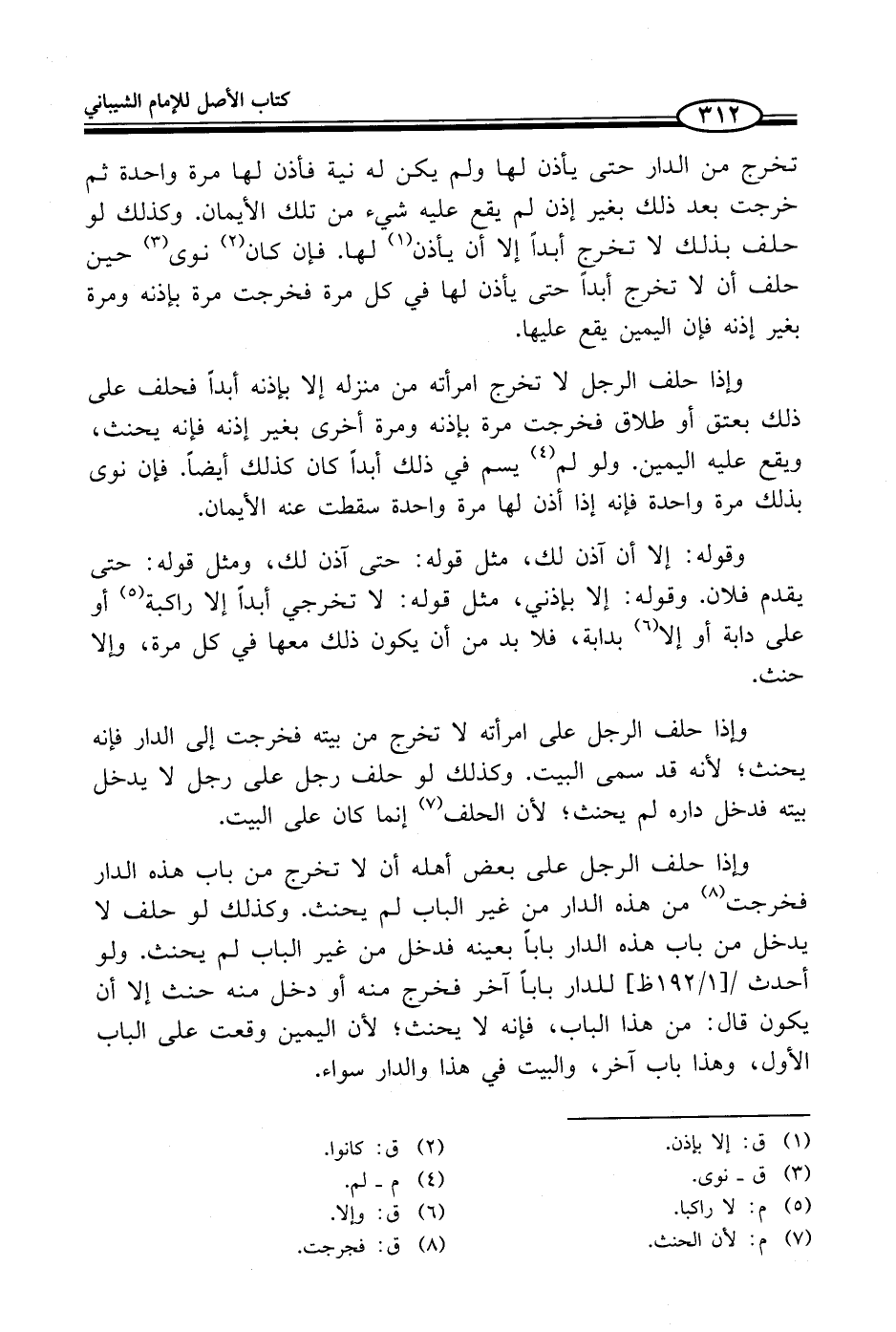 وإذا حلف الرجل على بعض أهله أن لا تخرج من باب هذه الدار فخرجت (¬8) من هذه الدار من غير الباب لم يحنث. وكذلك لو حلف لا يدخل من باب هذه الدار باباً بعينه فدخل من غير الباب لم يحنث. ولو أحدث للدار باباً آخر فخرج منه أو دخل منه حنث إلا أن يكون قال: من هذا الباب، فإنه لا يحنث؛ لأن اليمين وقعت على الباب الأول، وهذا باب آخر، والبيت في هذا والدار سواء.