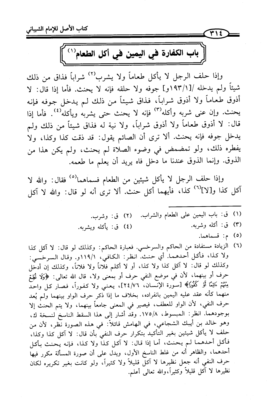 (¬6) الزيادة مستفادة من الحاكم والسرخسي. فعبارة الحاكم: وكذلك لو قال: لا آكل كذا ولا كذا، فأكل أحدهما. أي حنث. انظر: الكافي، 1/ 119 و. وقال السرخسي: وكذلك لو قال: لا آكل كذا ولا كذا، أو لا أكلم فلاناً ولا فلاناً، وكذلك إن أدخل حرف أو بينهما، لأن في موضع النفي حرف أو بمعنى ولا، قال الله تعالى: {لَا تُطِعْ مِنْهُمْ آثِمًا أَوْ كَفُورًا} [الإنسان: 24]، يعني ولا كفوراً، فصار كل واحد منهما كأنه عقد عليه اليمين بانفراده، بخلاف ما إذا ذكر حرف الواو بينهما ولم يُعد حرف النفي، لأن الواو للعطف، فيصير في المعنى جامعاً بينهما، ولا يتم الحنث إلا بوجودهما. انظر: المبسوط، 8/ 175. وقد أشار إلى هذا السقط الناسخ لنسخة ك، وهو خالد بن أيبك الشجاعي، في الهامش قائلًا: في هذه الصورة نظر، لأن من حلف لا يأكل شيئين بغير التأكيد بتكرار حرف النفي بأن قال: لا آكل كذا وكذا، فأكل أحدهما لم يحنث، أما إذا قال: لا آكل كذا ولا كذا، فإنه يحنث بأكل أحدهما، والظاهر أنه من غلط الناسخ الأول، ويدل على أن صورة المسألة مكرر فيها حرف النفي أنه جعل نظيرها لا آكل قليلاً ولا كثيراً، ولو كانت بغير تكريره لكان نظيرها لا آكل قليلاً وكثيرًا، والله تعالى أعلم.