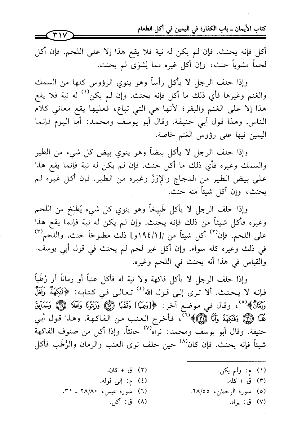 فإذا حلف الرجل لا يأكل فاكهة ولا نية له فأكل عنباً أو رمانًا أو رُطَباً فإنه لا يحنث. ألا ترى إلى قول الله (¬4) تعالى في كتابه: {فَاكِهَةٌ وَنَخْلٌ وَرُمَّانٌ} (¬5)، وقال في موضع آخر: {[وَعِنَبًا] وَقَضْبًا (28) وَزَيْتُونًا وَنَخْلًا (29) وَحَدَائِقَ غُلْبًا (30) وَفَاكِهَةً وَأَبًّا} (¬6)، فأخرج العنب من الفاكهة. وهذا قول أبي حنيفة. وقال أبو يوسف ومحمد: نراه (¬7) حانثاً. واذا أكل من صنوف الفاكهة شيئاً فإنه يحنث. فإن كان (¬8) حين حلف نوى العنب والرمان والرُّطَب فأكل
