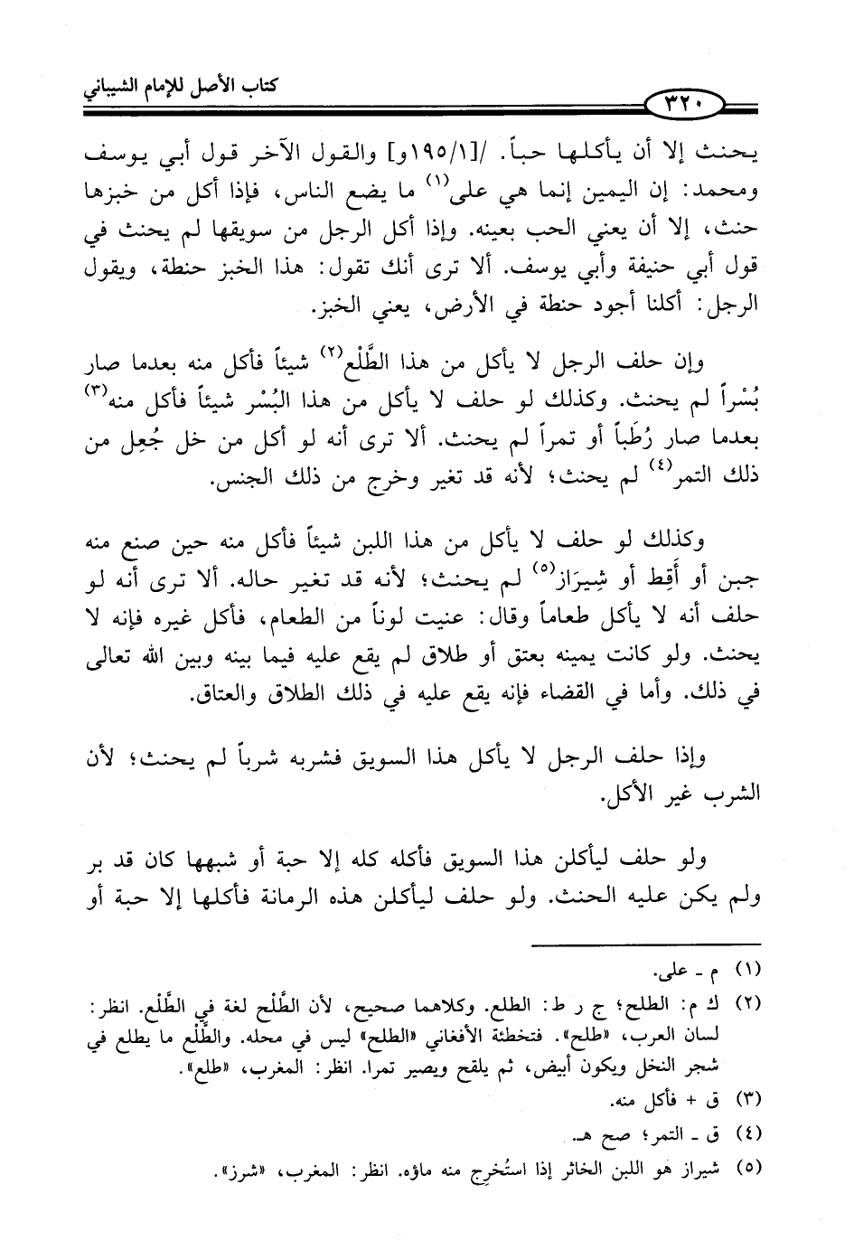 وكذلك لو حلف لا يأكل من هذا اللبن شيئاً فأكل منه حين صنع منه جبن أو أَقِط أو شِيرَاز (¬5) لم يحنث؛ لأنه قد تغير حاله. ألا ترى أنه لو حلف أنه لا يأكل طعاماً وقال: عنيت لوناً من الطعام، فأكل غيره فإنه لا يحنث. ولو كانت يمينه بعتق أوطلاق لم يقع عليه فيما بينه وبين الله تعالى في ذلك. وأما في القضاء فإنه يقع عليه في ذلك الطلاق والعتاق.