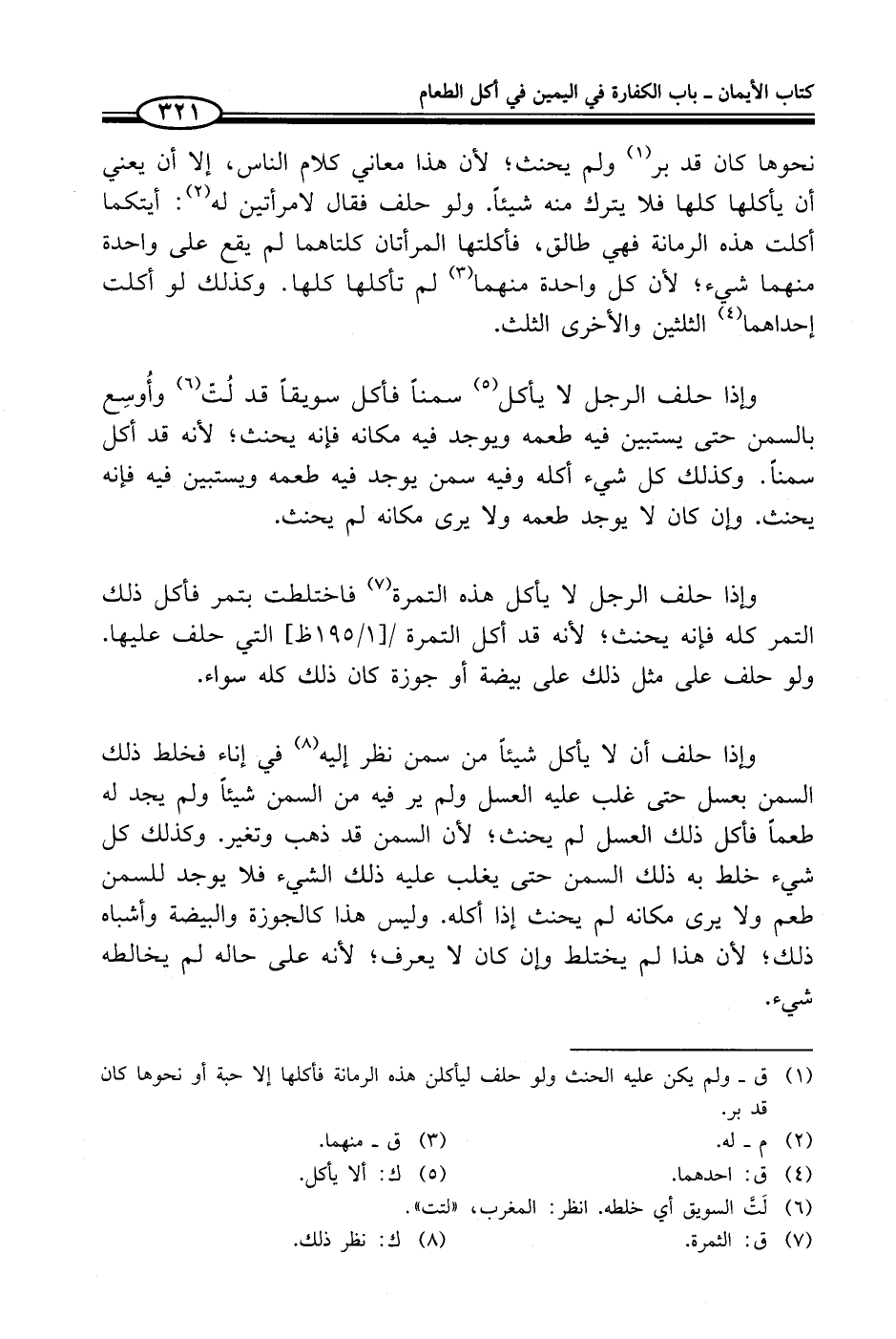 وإذا حلف الرجل لا يأكل (¬5) سمناً فأكل سويقاً قد لُتّ (¬6) وأُوسِع بالسمن حتى يستبين فيه طعمه ويوجد فيه مكانه فإنه يحنث؛ لأنه قد أكل سمنًا. وكذلك كل شيء أكله وفيه سمن يوجد فيه طعمه ويستبين فيه فإنه يحنث. وإن كان لا يوجد طعمه ولا يرى مكانه لم يحنث.