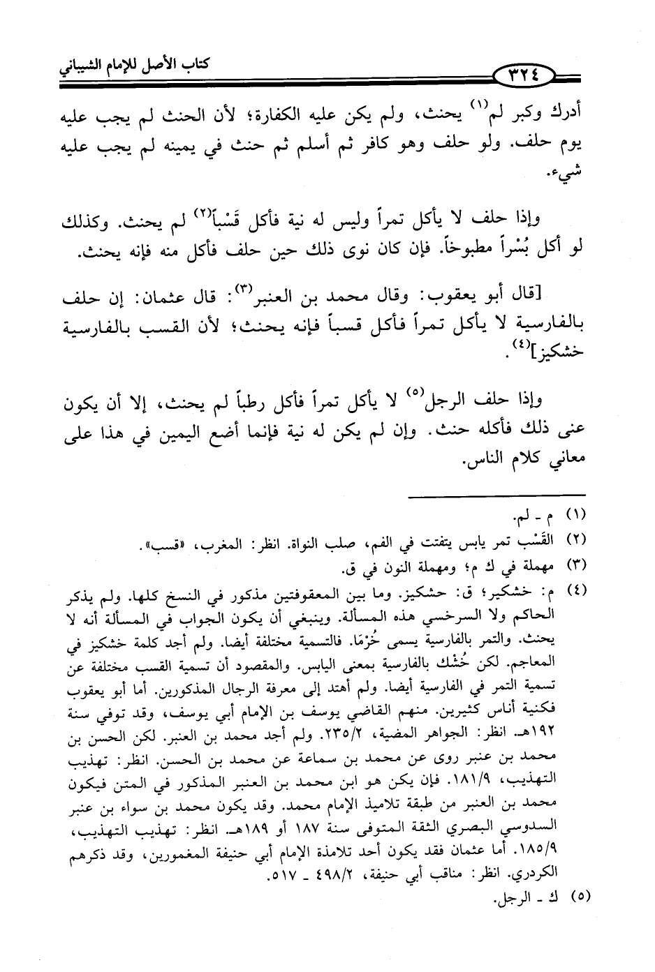 (¬4) م: خشكير؛ ق: حشكيز. وما بين المعقوفتين مذكور في النسخ كلها. ولم يذكر الحاكم ولا السرخسي هذه المسألة. وينبغي أن يكون الجواب في المسألة أنه لا يحنث. والتمر بالفارسية يسمى خُرْمَا. فالتسمية مختلفة أيضاً. ولم أجد كلمة خشكيز في المعاجم. لكن خُشْك بالفارسية بمعنى اليابس. والمقصود أن تسمية القسب مختلفة عن تسمية التمر في الفارسية أيضاً. ولم أهتد إلى معرفة الرجال المذكورين. أما أبو يعقوب فكنية أناس كثيرين. منهم القاضي يوسف بن الإمام أبي يوسف، وقد توفي سنة 192 هـ انظر: الجواهر المضية، 2/ 235. ولم أجد محمد بن العنبر. لكن الحسن بن محمد بن عنبر روى عن محمد بن سماعة عن محمد بن الحسن. انظر: تهذيب التهذيب، 9/ 181. فإن يكن هو ابن محمد بن العنبر المذكور في المتن فيكون محمد بن العنبر من طبقة تلاميذ الإمام محمد. وقد يكون محمد بن سواء بن عنبر السدوسي البصري الثقة المتوفى سنة 187 أو 189 هـ انظر: تهذيب التهذيب، 9/ 185. أما عثمان فقد يكون أحد تلامذة الإمام أبي حنيفة المغمورين، وقد ذكرهم الكردري. انظر: مناقب أبي حنيفة، 2/ 498 - 517.
