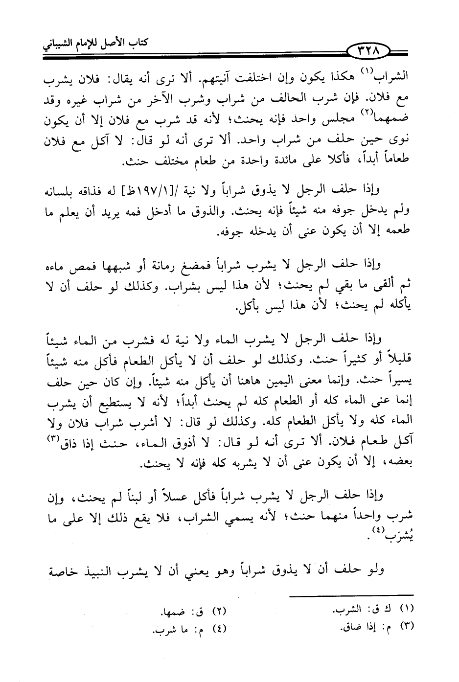 وإذا حلف الرجل لا يشرب الماء ولا نية له فشرب من الماء شيئاً قليلاً أو كثيراً حنث. وكذلك لو حلف أن لا يأكل الطعام فأكل منه شيئاً يسيراً حنث. وإنما معنى اليمين هاهنا أن يأكل منه شيئاً. وإن كان حين حلف إنما عنى الماء كله أو الطعام كله لم يحنث أبداً؛ لأنه لا يستطيع أن يشرب الماء كله ولا يأكل الطعام كله. وكذلك لو قال: لا أشرب شراب فلان ولا آكل طعام فلان. ألا ترى أنه لو قال: لا أذوق الماء، حنث إذا ذاق (¬3) بعضه، إلا أن يكون عنى أن لا يشربه كله فإنه لا يحنث.