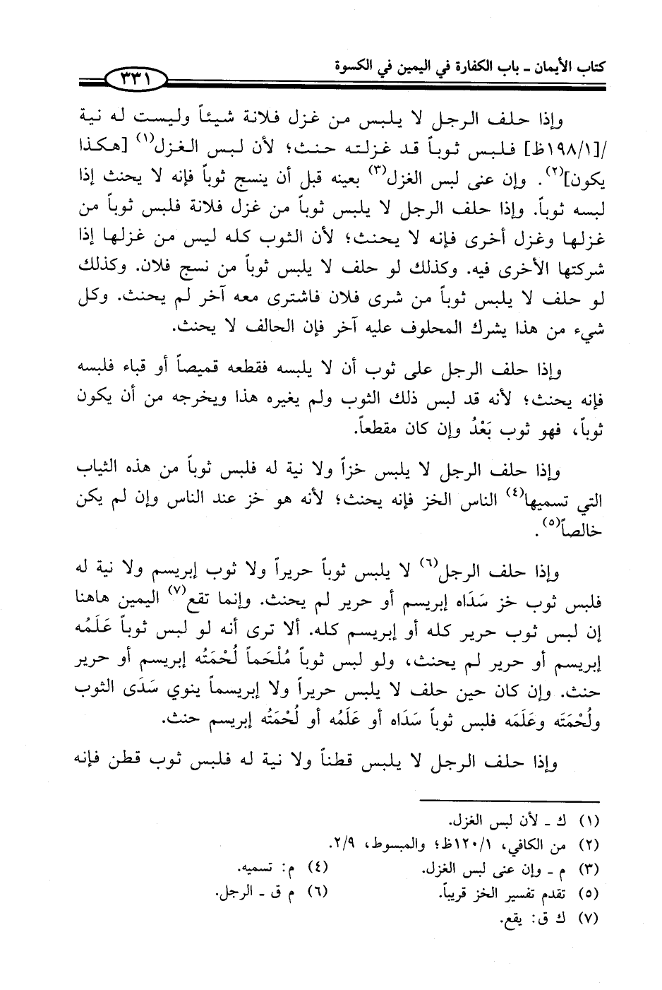 واذا حلف الرجل (¬6) لا يلبس ثوباً حريراً ولا ثوب إبريسم ولا نية له فلبس ثوب خز سَدَاه إبريسم أو حرير لم يحنث. وإنما تقع (¬7) اليمين هاهنا إن لبس ثوب حرير كله أو إبريسم كله. ألا ترى أنه لو لبس ثوباً عَلَمُه إبريسم أو حرير لم يحنث، ولو لبس ثوباً مُلْحَماً لُحْمَتُه إبريسم أو حرير حنث. وإن كان حين حلف لا يلبس حريراً ولا إبريسماً ينوي سَدَى الثوب ولُحْمَتَه وعَلَمَه فلبس ثوباً سَدَاه أو عَلَمُه أو لُحْمَتُه إبريسم حنث.