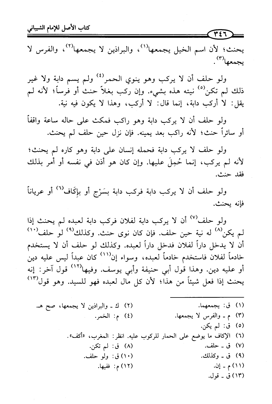 ولو حلف أن لا يركب دابة فركب دابة بسَرْج أو بإِكَاف (¬6) أو عرياناً فإنه يحنث. ولو حلف (¬7) أن لا يركب دابة لفلان فركب دابة لعبده لم يحنث إذا لم يكن (¬8) له نية حين حلف. فإن كان نوى حنث. وكذلك (¬9) لو حلف (¬10) أن لا يدخل داراً لفلان فدخل داراً لعبده. وكذلك لو حلف أن لا يستخدم خادماً لفلان فاستخدم خادماً لعبده، وسواء إن (¬11) كان عبداً ليس عليه دين أو عليه دين. وهذا قول أبي حنيفة وأبي يوسف. وفيها (¬12) قول آخر: إنه يحنث إذا فعل شيئاً من هذا؛ لأن كل مال لعبده فهو للسيد. وهو قول (¬13)